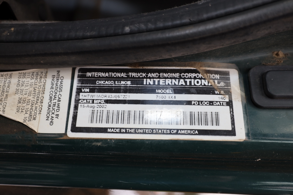 2003 International WorkStar 7500. VIN: 1HTWMADR43J057221. Body: Chassis 2D. Engine: 8.7L I6 DI Diesel. Odometer reading: 53578. Eaton Fuller transmission. Seller notes: Does not run/operate, 4x4,Was running. Quit, won’t start.Found out there was water in the fuel. Drained out, put fresh in, and can’t get it to start.
