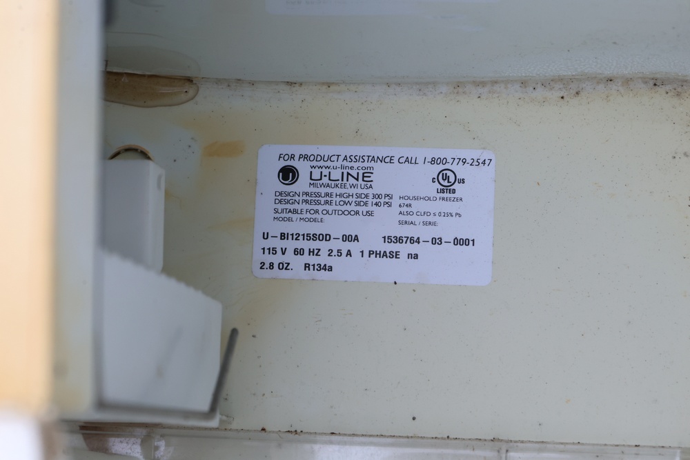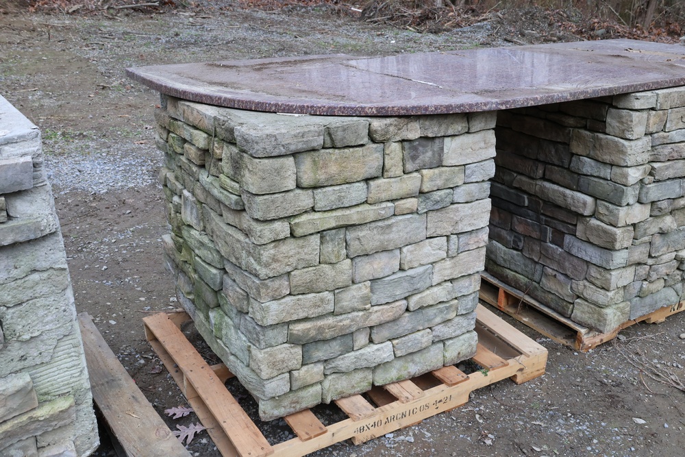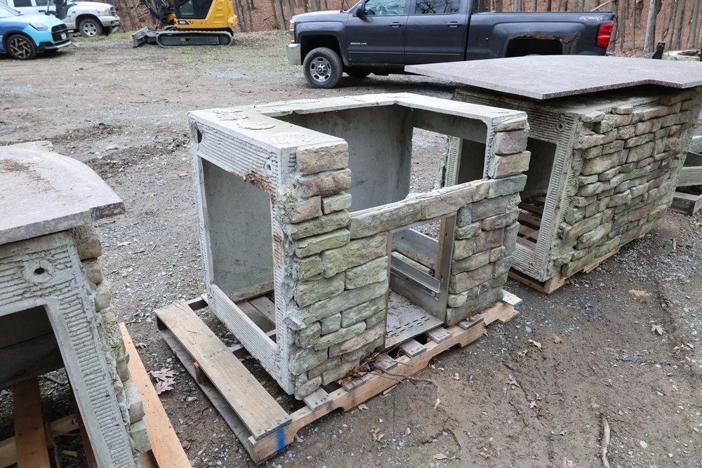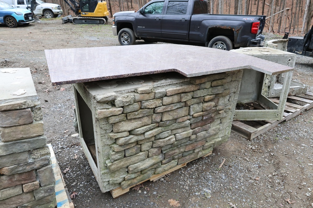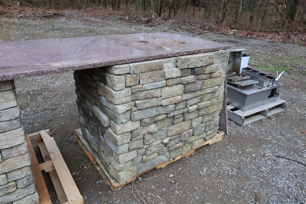 Outdoor kitchen consisting of multiple island bases with stone-veneer exteriors, matching stone countertop sections, and a stainless-steel U-Line freezer (model U-BI1215SOD-00A). The bases are designed to accommodate built-in components such as grills, refrigerators, or sink modules. Also included are stainless-steel food-prep and service units with integrated compartments and a faucet assembly. The first photo is provided for reference only; all other photos show the items included in the lot. Assistance will be available to load onto an appropriate vehicle/trailer. Freezer in unknown condition.