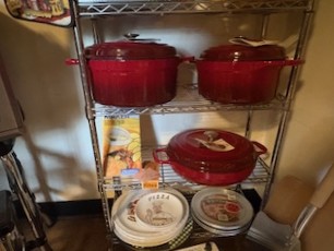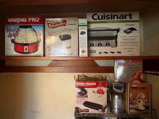 Kitchen Counter Appliances and Cookware, featuring Cuisinart. Over one-dozen items: Cuisinart electric griddle (in box); popcorn makers; slicer/shredder; blender; set of three red cast iron pans with lids; air fryer oven; stir-fry pan (in box); more. See photos. Shelves not incl.