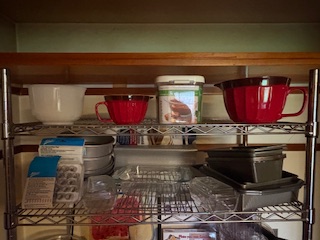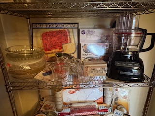 Bakeware. Assorted size baking pans for pies, loaf, muffins, cakes (metal and ceramic with lids); food chopper; measuring cups (assorted sizes); marble baking stone (in box); crocks; more. See photos. Shelves not incl.