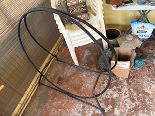Lawn and Garden Décor, Log Holder. set of four stacking outdoor armchairs; large round log holder, 40"diam x21"Dx42"H; lawn statues; planters; small folding table (indoor use); indoor nursery (boxed); edge trimmer; copper planter & watering cans; more. See photos.