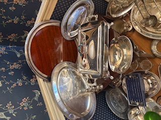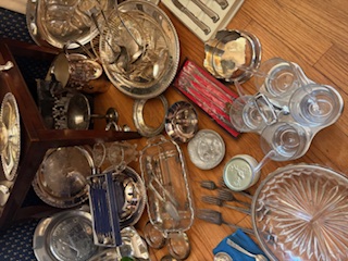 Silverplate Entertaining. vintage silverplate ent incl: flatware set in box; platters; bowls; pitcher; covered casserole; gray boat with tray: coasters; glass items, incl: trays; condiment set; knife sets (in boxes). See photos.