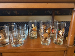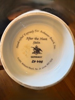 Bar Cabinet and Barware. German steins, incl "After the Hunt" #24/448 (see maker's mark); crystal & glass stemware & barware, incl beer mugs; plates; pheasant beverage glass set; ice bucket; cheese board with knife; two-drawer wood cab with storage, open shelf, drop sides, 58"W (open)x18"Dx33"H.