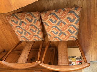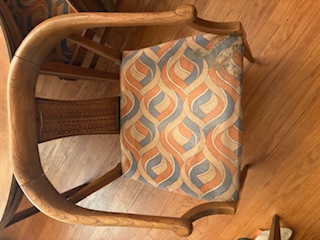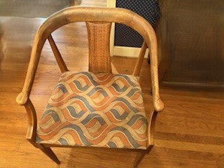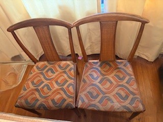 Mid-Century Thomasville Dining Set. Oval wood table, 5'Wx4'Dx38"H with beveled edge & one table insert, approx. 1'W; set of 6 chairs (4 side, 2 arm) with patterned seats. See damage to one chair. Items seen in background not incl.