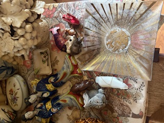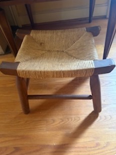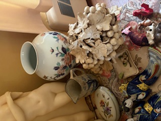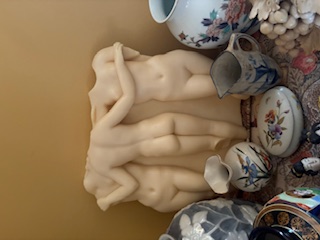 Vintage Décor and Foot Stool. Ceramic statue of three nudes; Asian décor; covered ceramic jar (pinecone-motif); vases (tallest 11"H); antique pitcher; covered dish; rush foot stool with wood legs; small table & covered opt. See photos.