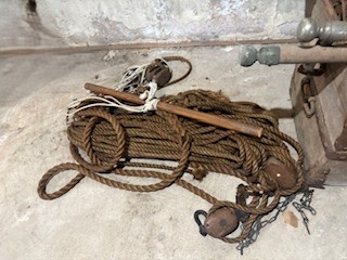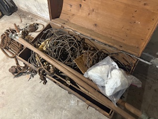 Trapeze in Wood Trunk. vintage ropes and pullies for trapeze; wood chest, 40"Wx28"H. See photos.