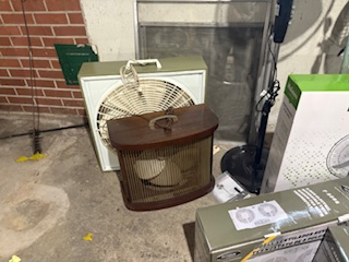 Floor, Box and Window Fans. Seven floor fans; two box fans; two Holmes fans (in boxes); three window fans; one vintage fan in wood casing.