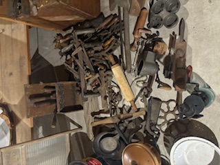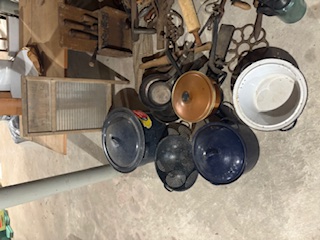 Vintage Tools and Cookware. Antique washboard; assort galvanized pots with lids; lg assort of vintage & antique hand tools. See photos for qty.
