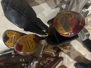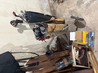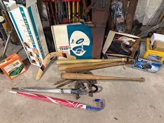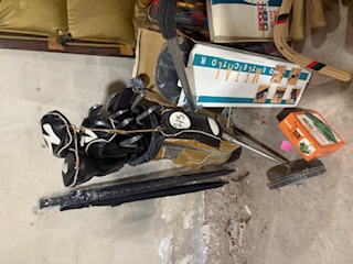 Outdoor Sports, featuring Toboggan. Spaulding and Wilson golf clubs in bags; vintage wood toboggan with padded seats, 6'L; vintage wood sled. See photos for details.