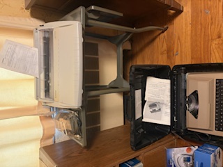 Office Furniture and Equipment. Two-drawer wood file cab on wheel; printer stand with shelves; assort office items and equipment, incl typewriters; Dell printer; much more! Dresser seen in photo incl in lot #48.