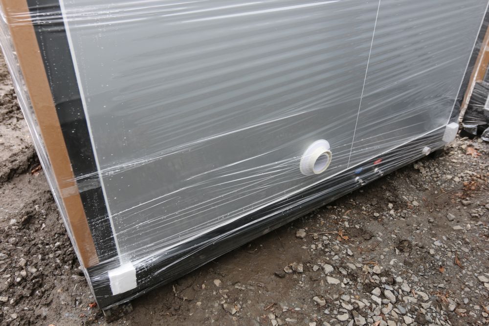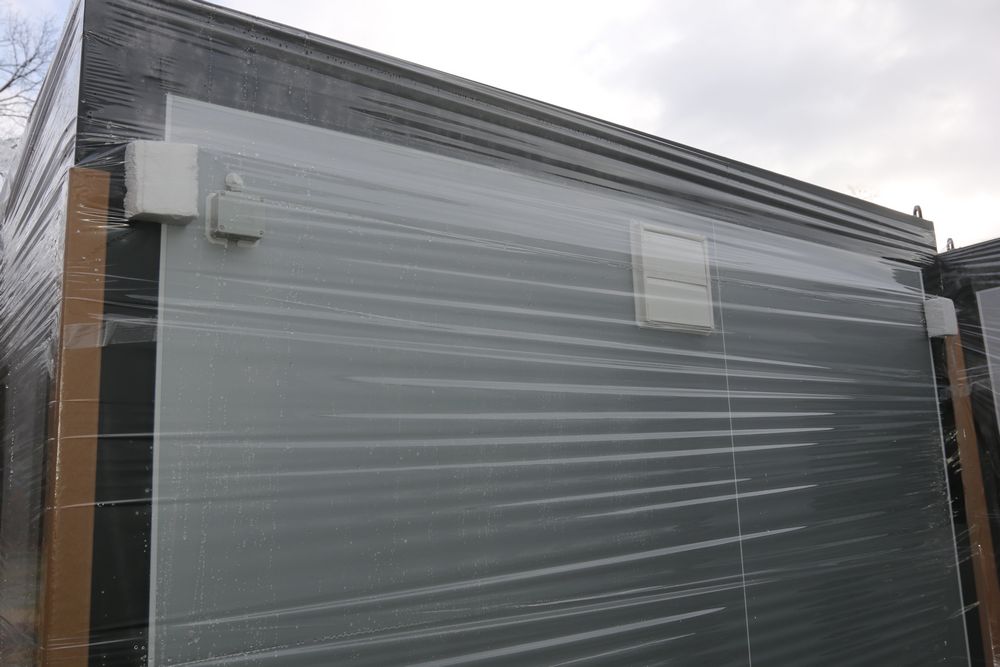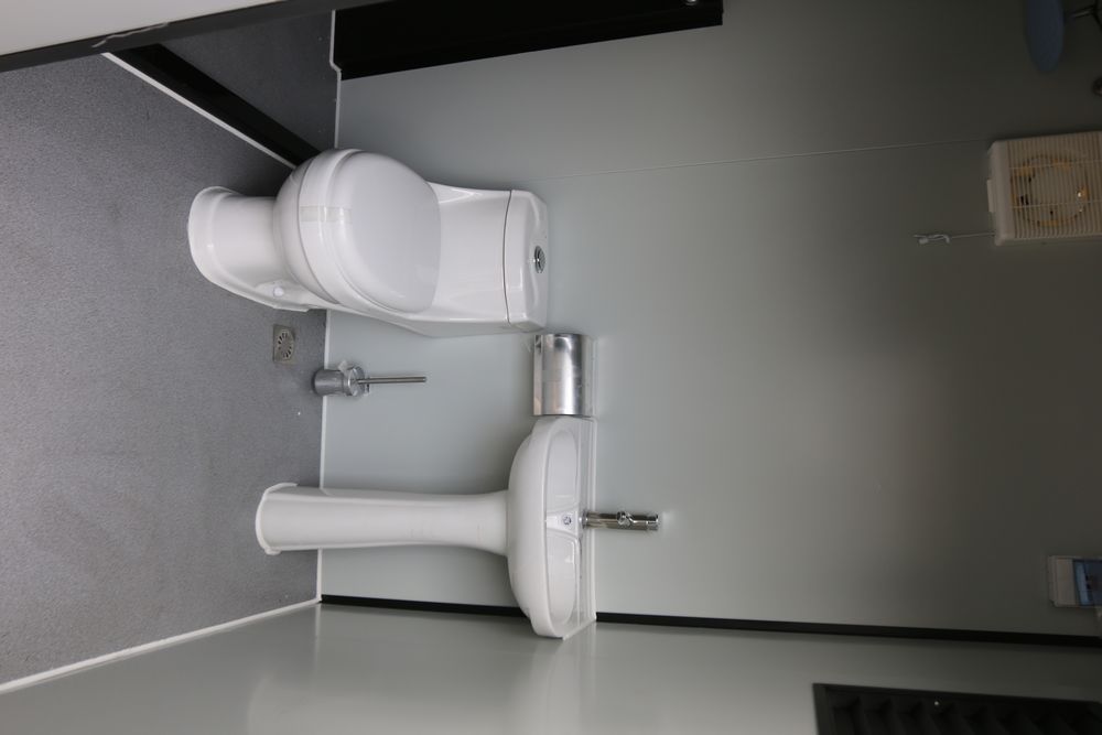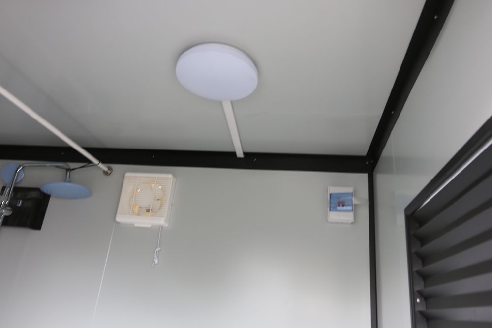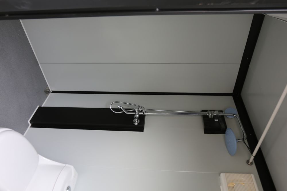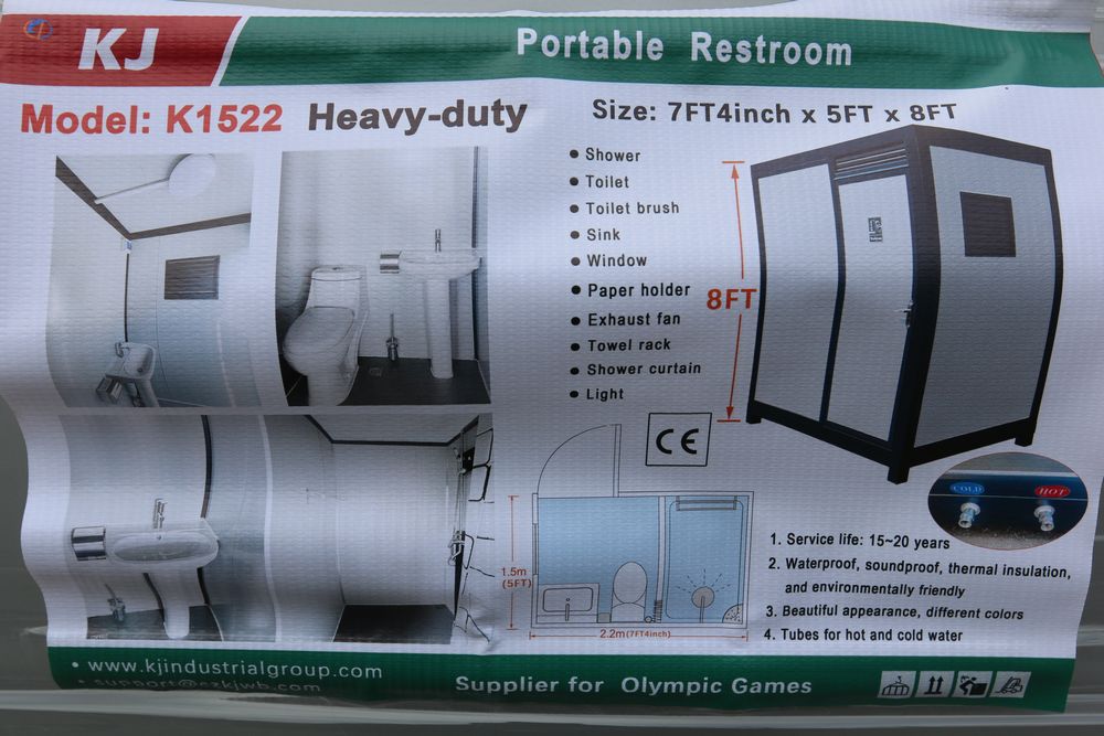 New 2025 KJ portable restroom 7'4" X 5' X 8', includes shower, toilet, toilet brush, sink, window, paper holder, exhaust fan, towel rack, shower curtain, light, model K1522.