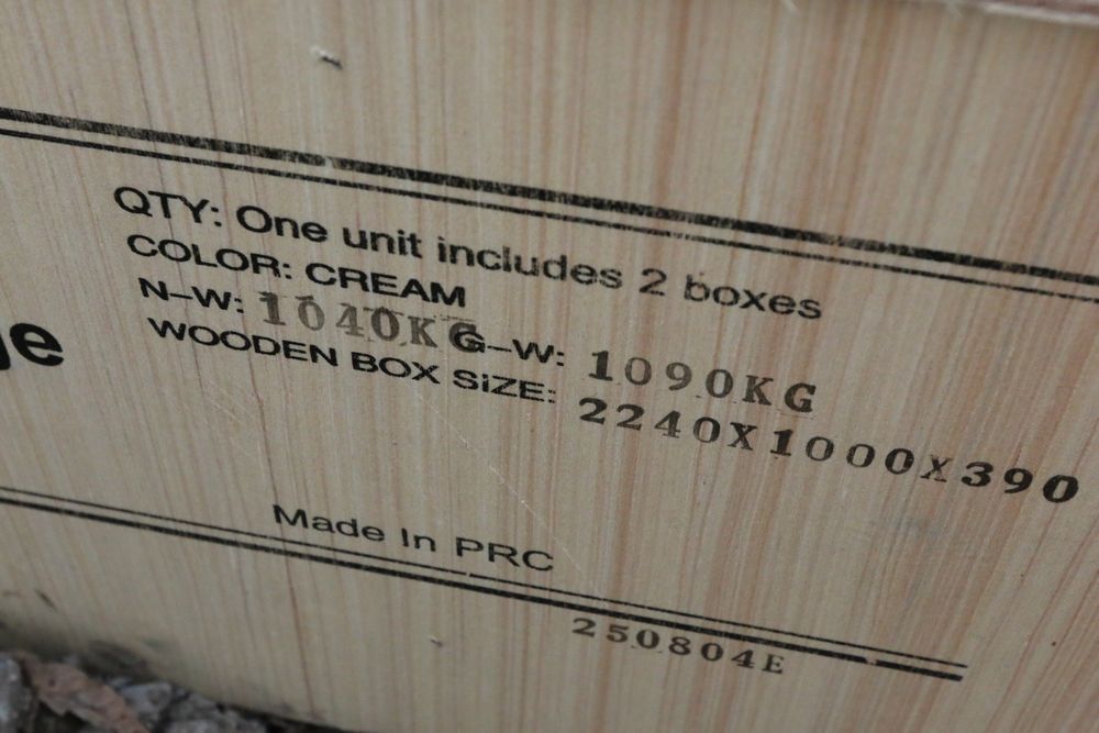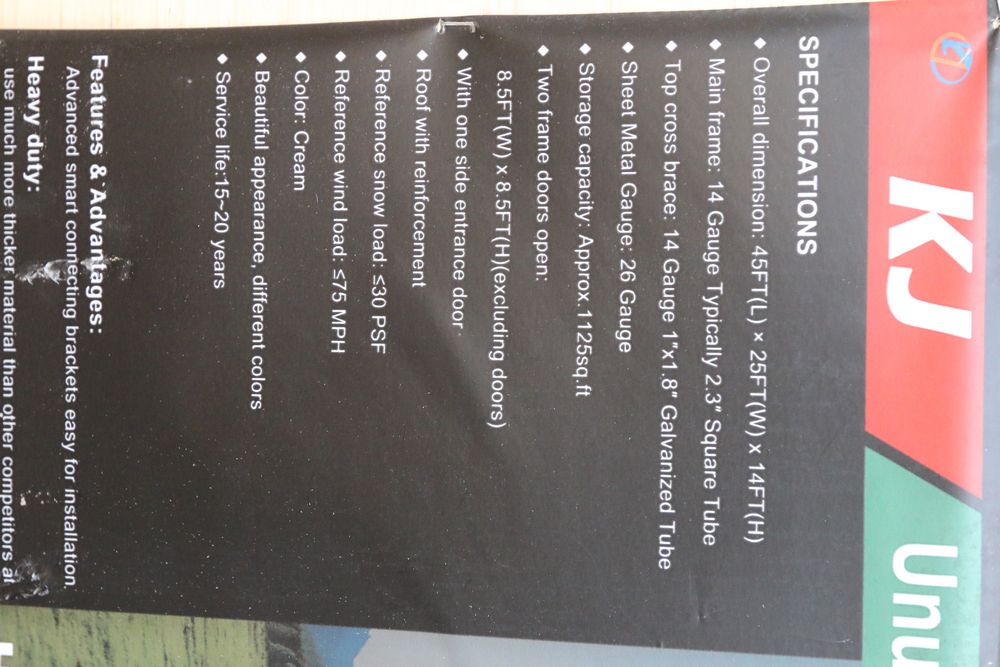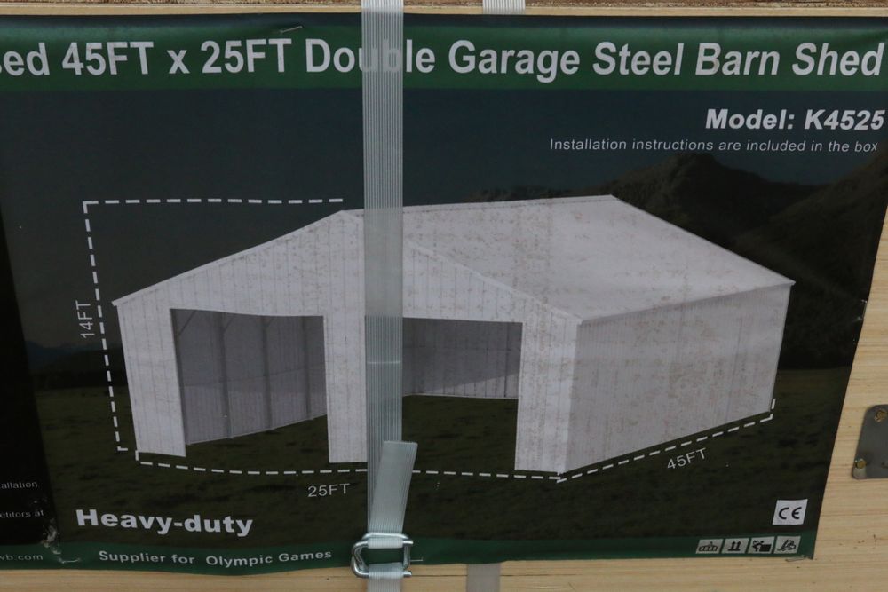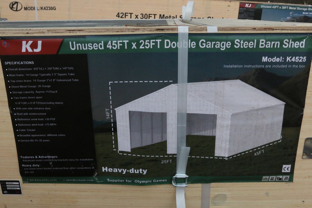 New KJ unused 45ft. x 25ft. double garage steel barn shed model K4525, in wood crate.