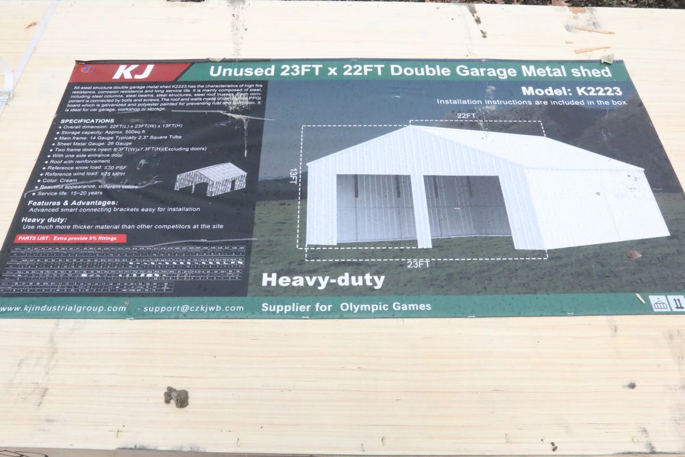 Items include new 2025 CFG Industrial mini excavators, gas powered mini excavators; new 2025 KJ 20' bi-parting iron gates, double garage metal shed, all-steel carport, livestock metal shed, hot-dip galvanized field fence, portable restroom; new MIVA mini excavator attachments: auger, rake, ripper, hedge cutter, hydraulic thumb; tilting excavator bucket; rubber track; new 2025 GIYI skid steer fork attachment; new 2025 SKLP fork extension; new 2025 MIG welder; new Husky black tool locker; new 2025 CFG Industrial mini skid steer backhoe & more. Items are located in Pleasant Valley, NY. Preview is highly recommended.