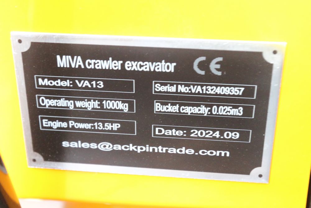 New 2025 MIVA mini excavator model VA13 w/ thumb, tracks, 13.5 HP engine. Hours read less than one hour.