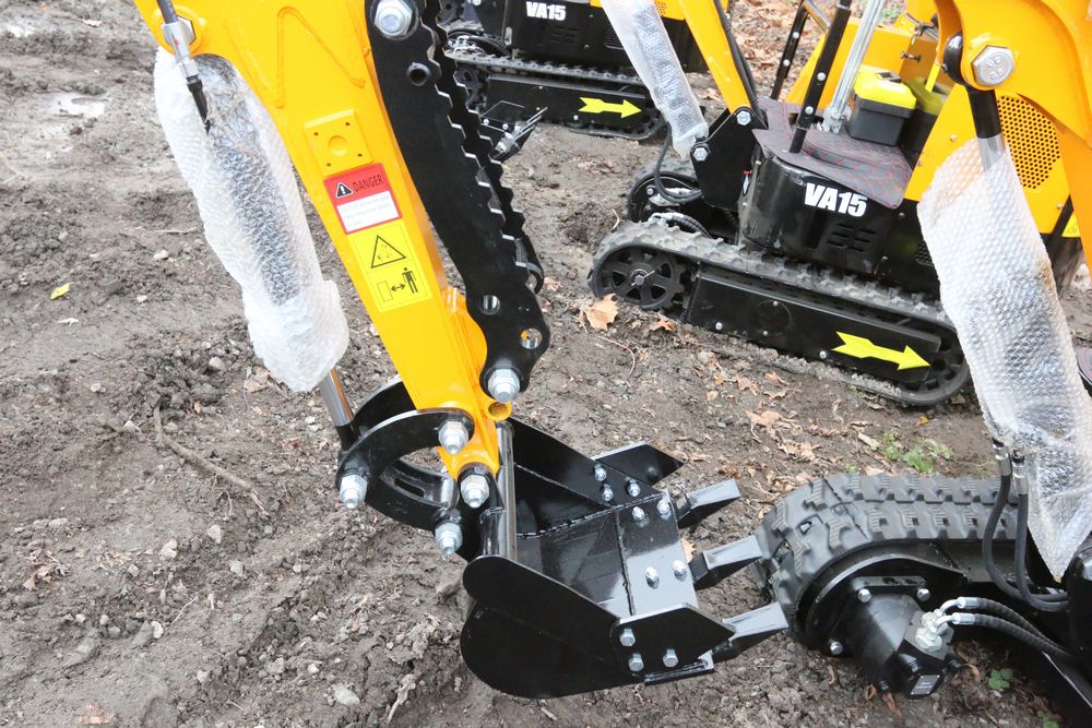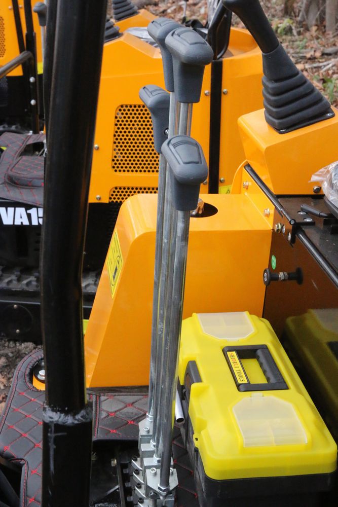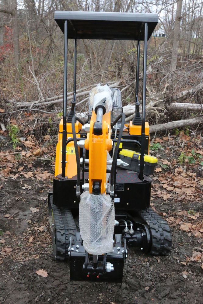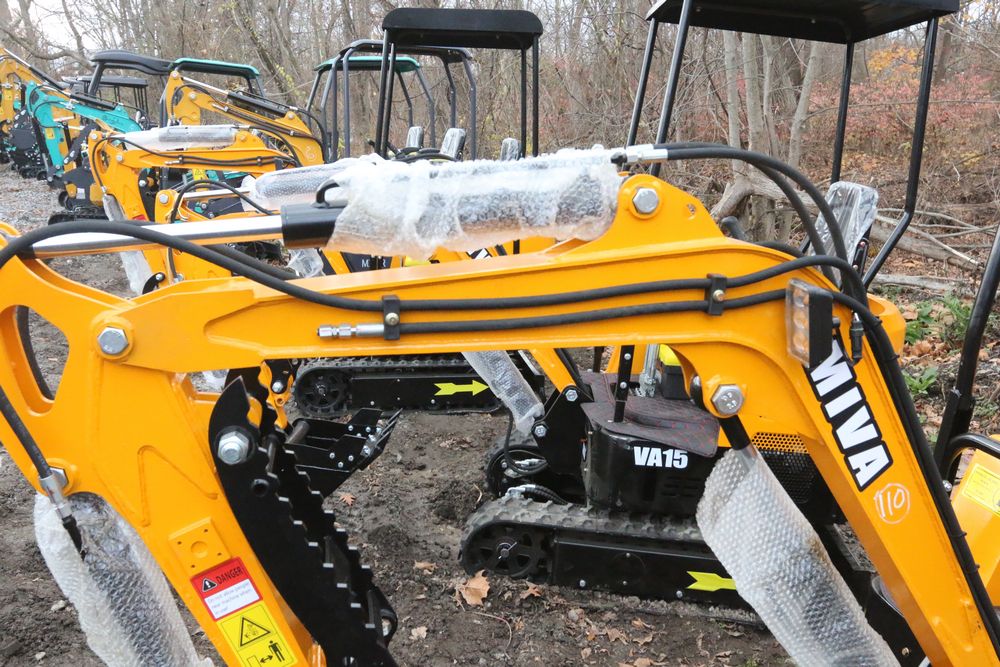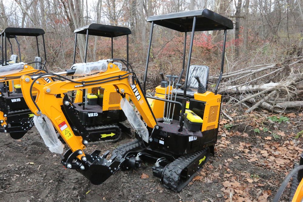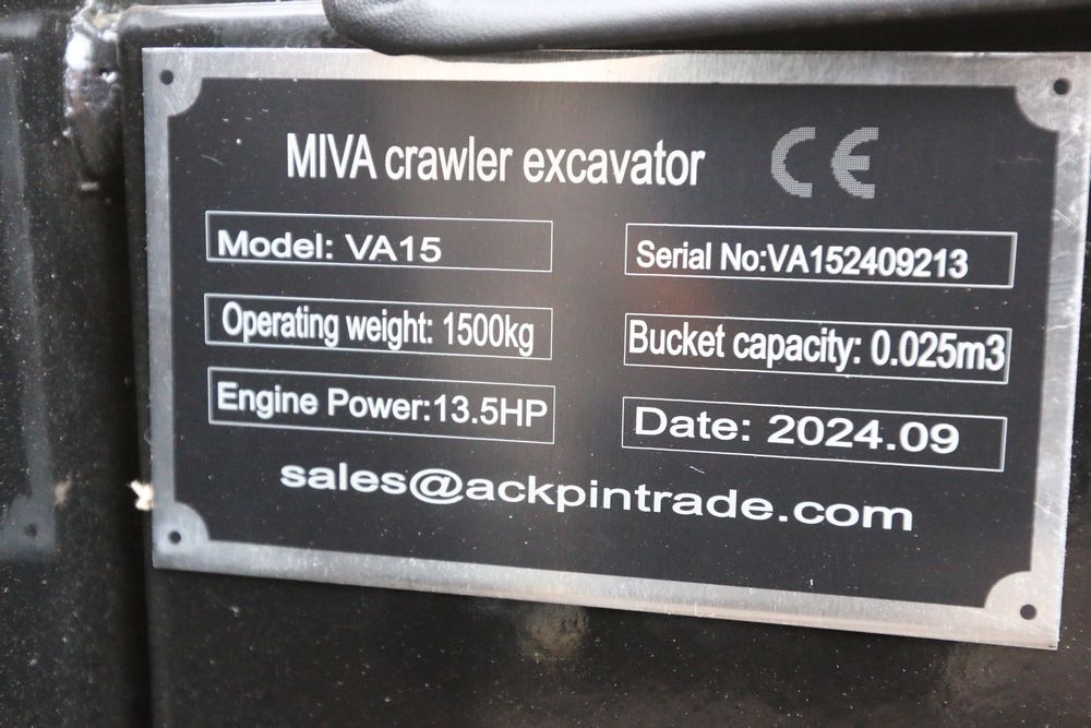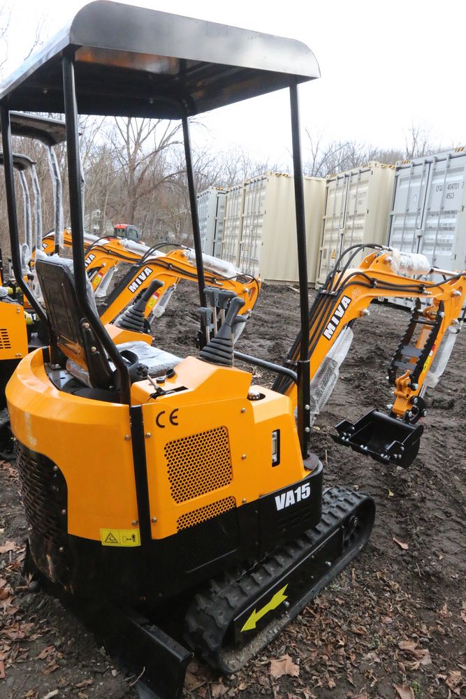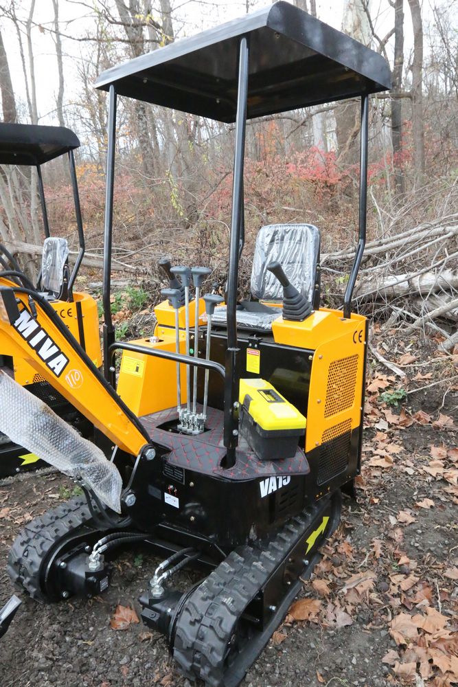 New MIVA mini excavator model: VA15, 13.5hp Briggs and Stratton gas engine, w/ thumb, Hydraulic Boom & Bucket Controls, bucket, with canopy and support bars. Hours reading less than one hour.