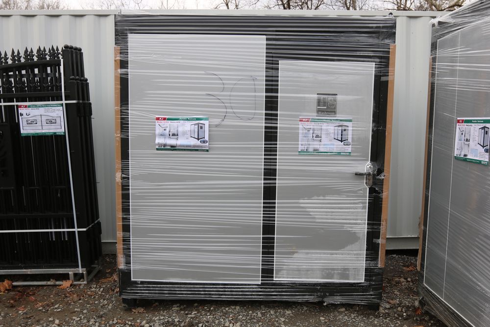 New 2025 KJ portable restroom 7'4" X 5' X 8', includes shower, toilet, toilet brush, sink, window, paper holder, exhaust fan, towel rack, shower curtain, light, model K1522.