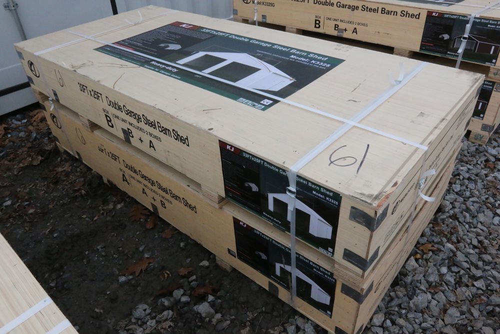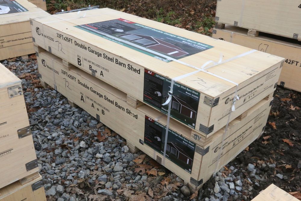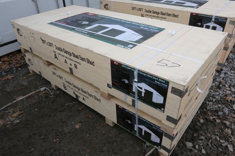 New 2025 KJ unused 33ftx25ft double garage barn shed model K3325, in wood crate.
