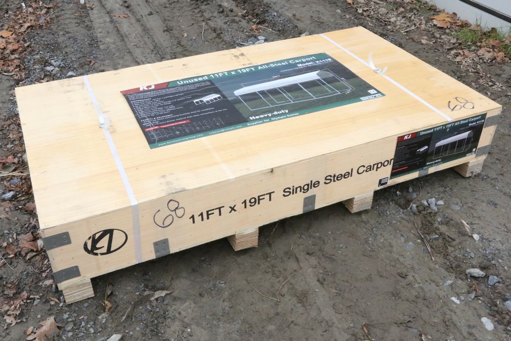 New KJ All-steel carport, 11'Wx20'Lx9'T, model K1119, in wood crate.