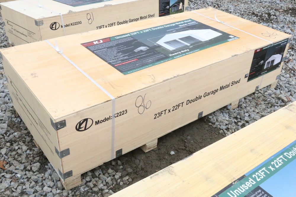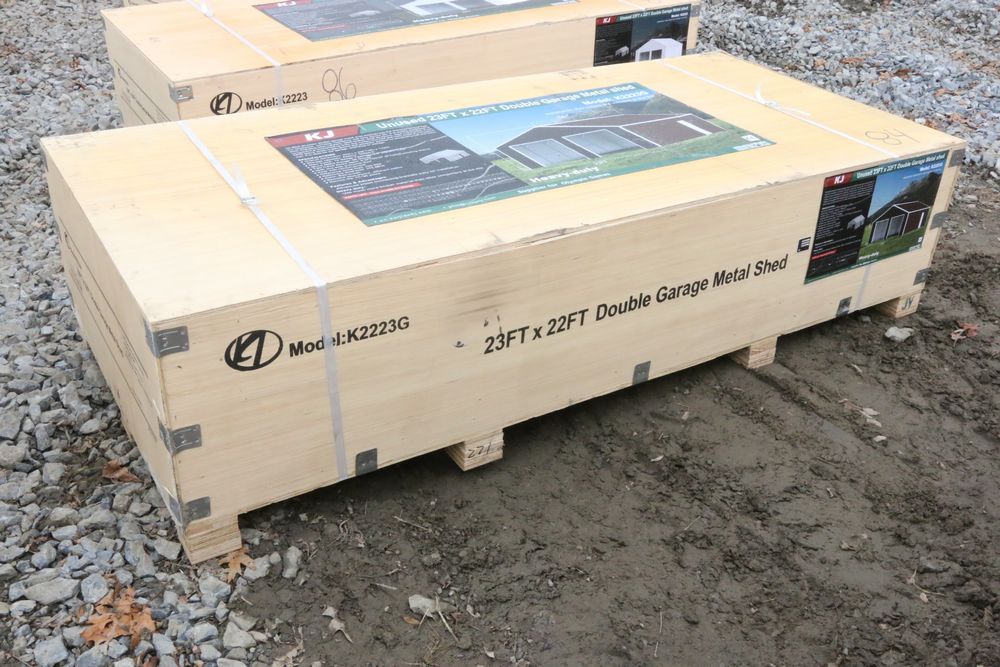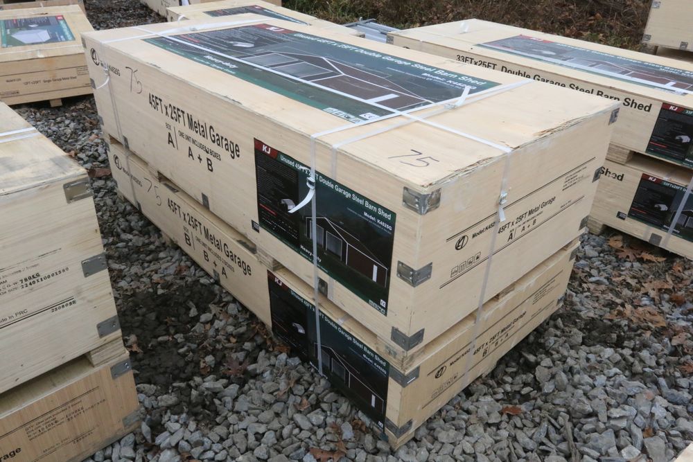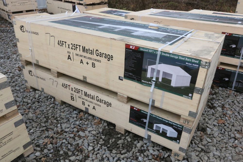 New KJ unused 45ft. x 25ft. double garage steel barn shed model K4525, in wood crate.
