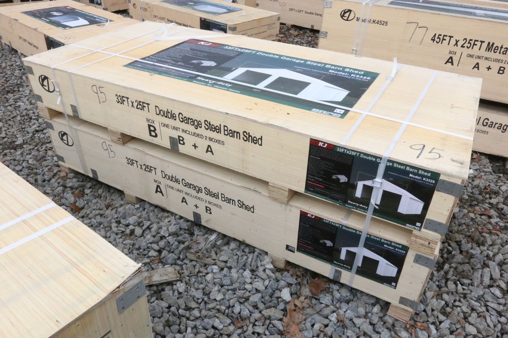 New KJ 33ftx25ft double garage steel barn shed in wood crate, model K3325.