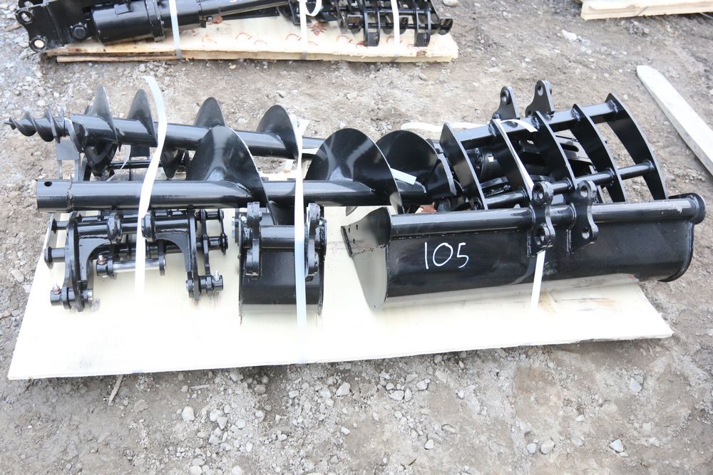 New MIVA 8pc mini excavator attachment set with 200mm bucket, 800mm bucket, quick hitch, 20cm auger, 30cm auger, rake, ripper, and grapple.