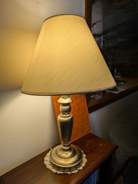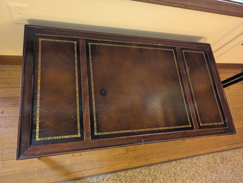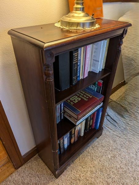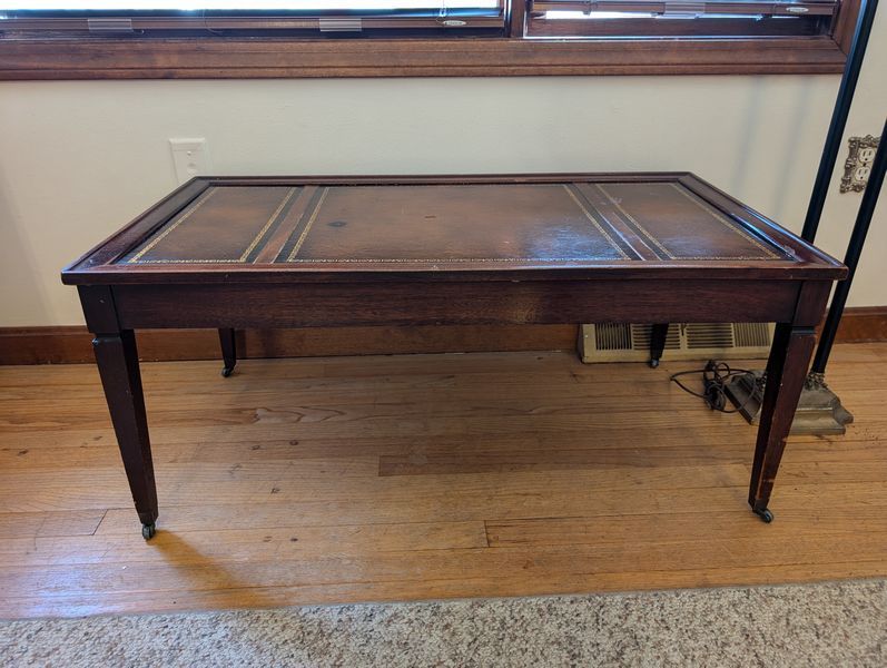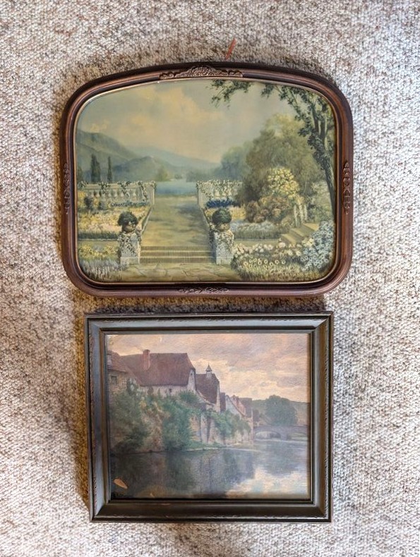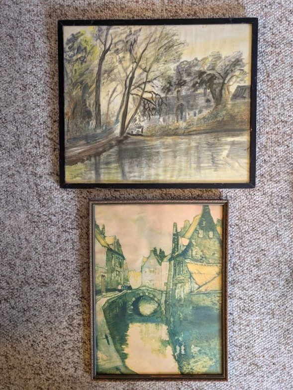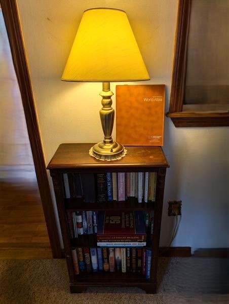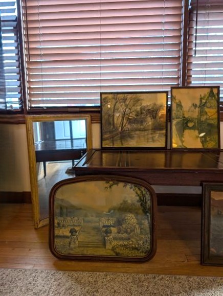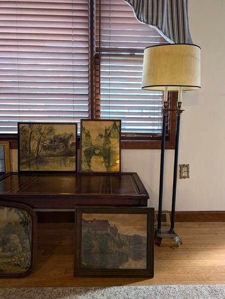 Vintage Furniture and Art. Vintage coffee table; small wood bookcase (optional books); table lamp (matches lamp in lot #3); Vintage floor lamp with shade; four pieces antique wall art. See photos for details.