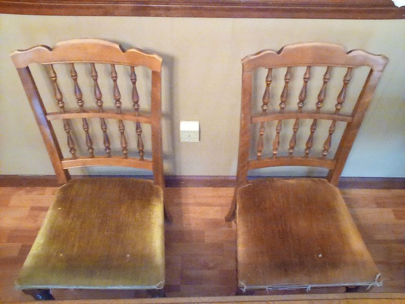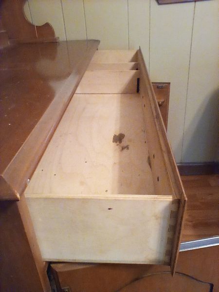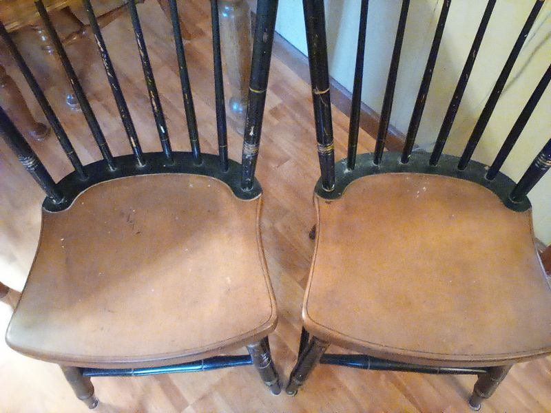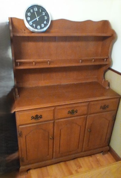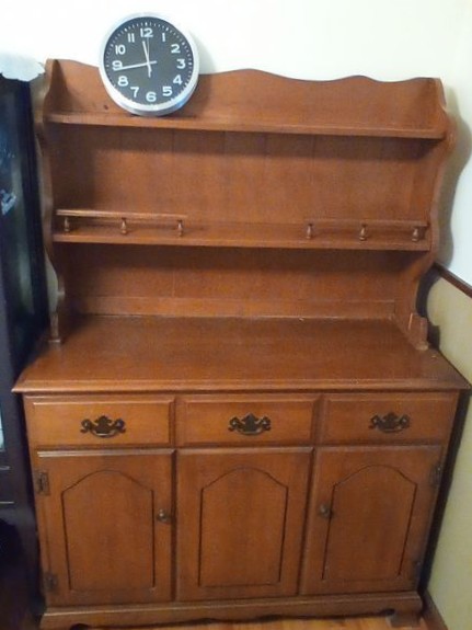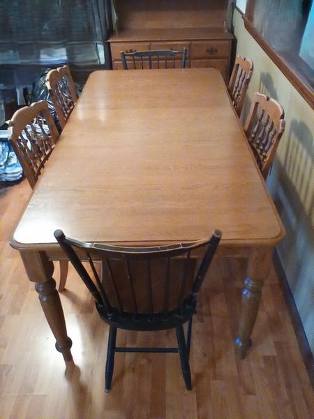 Maple Farm Table and Country Hutch. Maple oblong table (seats eight); coordinating open-style hutch with plate grooves; large dovetailed linen drawer & storage below; pair of stenciled Hitchcock chairs. See photos for condition of chairs and clean break in hutch (does not effect functionality).