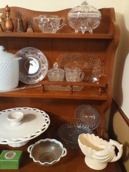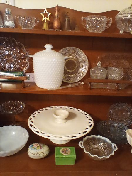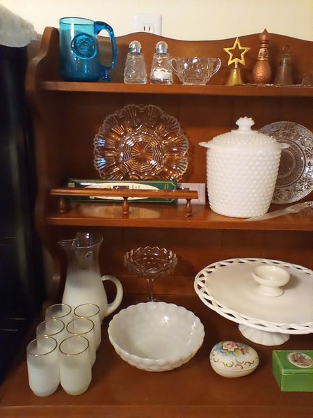 Vintage Décor, featuring Milk Glass. Approx 3-doz items, incl: pedestal cake dish; seven-piece West Virginian beverage set (pitcher & 6 glasses); hobnail double-handle dish; McCoy vessel; creamer & sugar sets; S&P; egg dash; white hobnail covered canister; two-piece ceramic egg dish; much more as seen in photos. Furniture incl in lot #6.