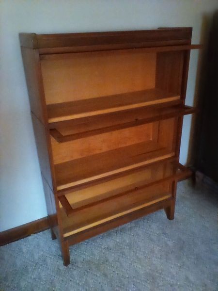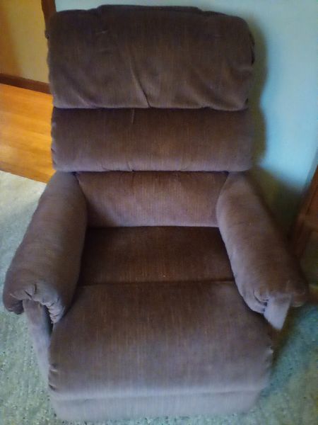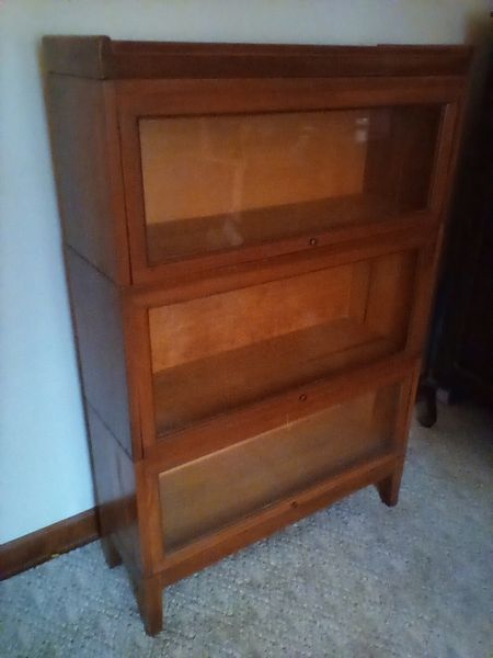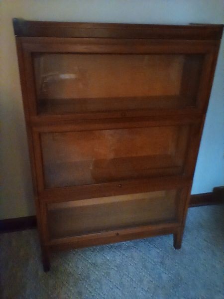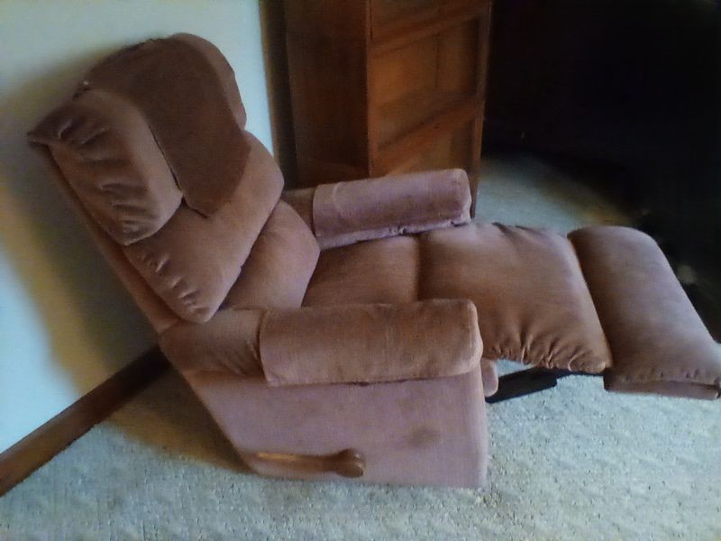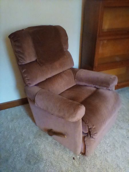 La-Z-Boy Recliner; Barrister Bookcase. Rose-colored upholstered La-Z-Boy recliner; three section glass front barrister bookcase.