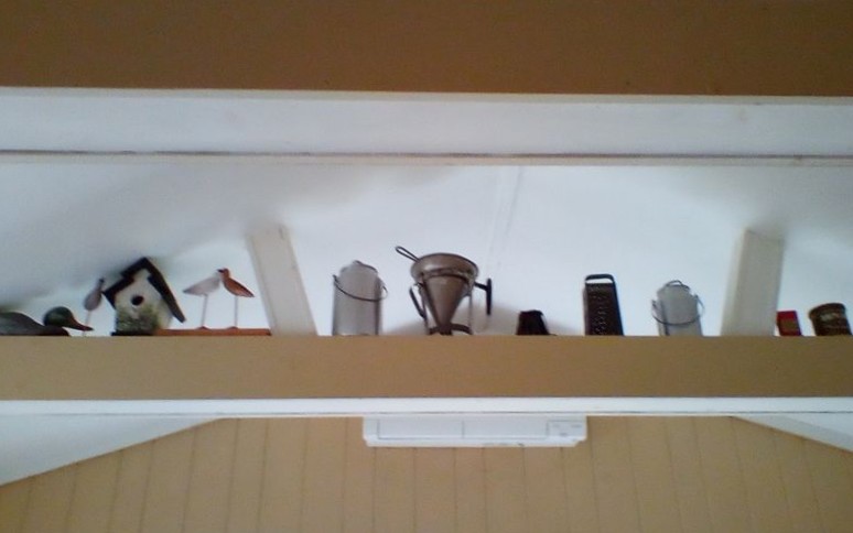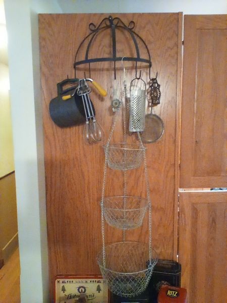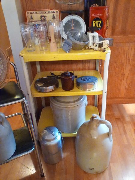 Kitchen antiques, featuring Crocks. Vintage & antique kitchen gadgets; pot rack; metal rolling table; step stool; crocks (var sizes); bird house décor; sifter; other related items as seen in photos.