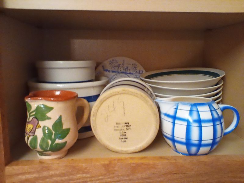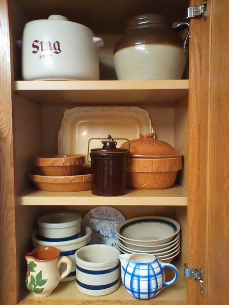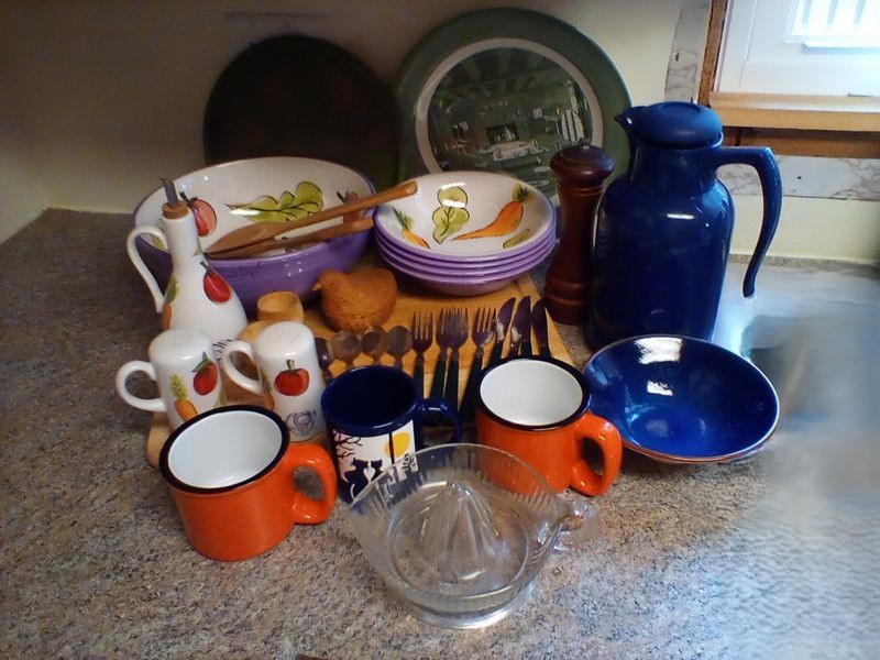 Colorful Kitchen, featuring Vintage Green Colonial Homestead Dish Set. Gr underglaze Colonial Homestead dish set (see photos); US ovenware covered crocks; pitchers; platters; bowls; crocks; mugs; modern hand-crafted salad set; Vintage flatware. See photos for qty and additional items.