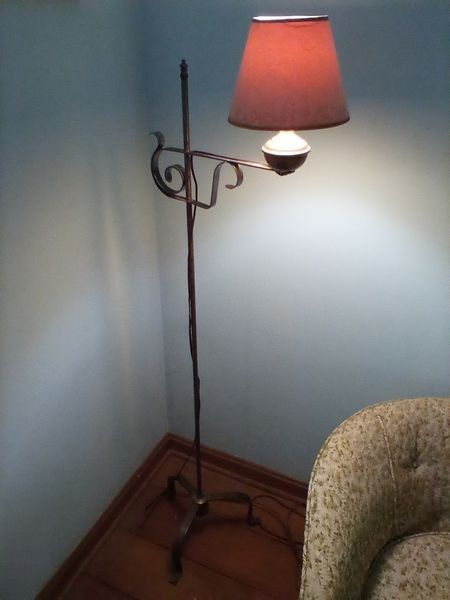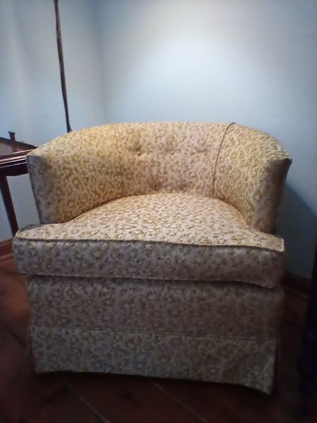 Vintage Furniture. Vintage furniture including barrel chair by Lance Decorators, 28"Wx20"Dx2'H; tea table (no glass), 29"Wx18"Dx25"H; metal floor lamp with shade, 54"H; two pieces wall art.