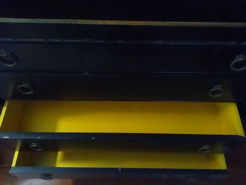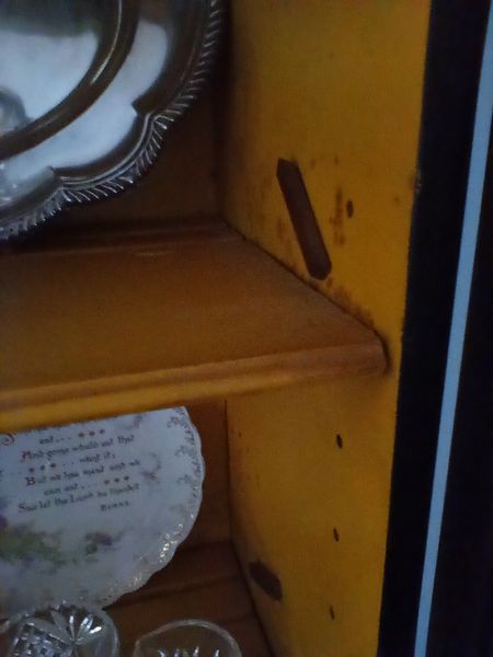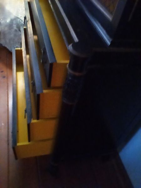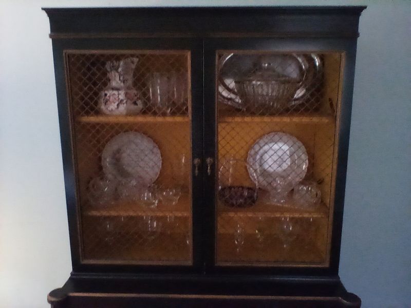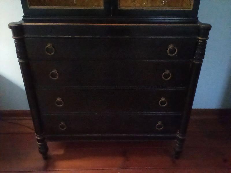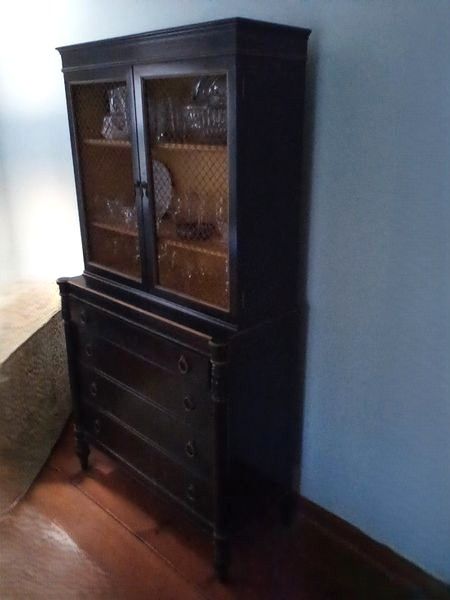Antique China Cabinet. Dark wood China cab with glass front hutch & wood adjustable shelves over four dovetailed drawers, 26'Wx16"Dx68"H. Contents seen in photos not incl.