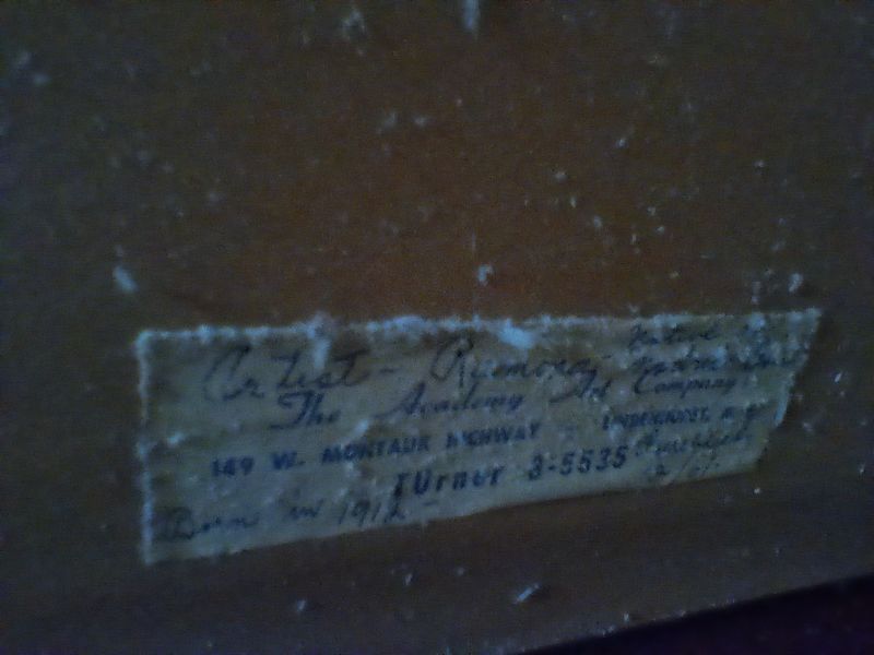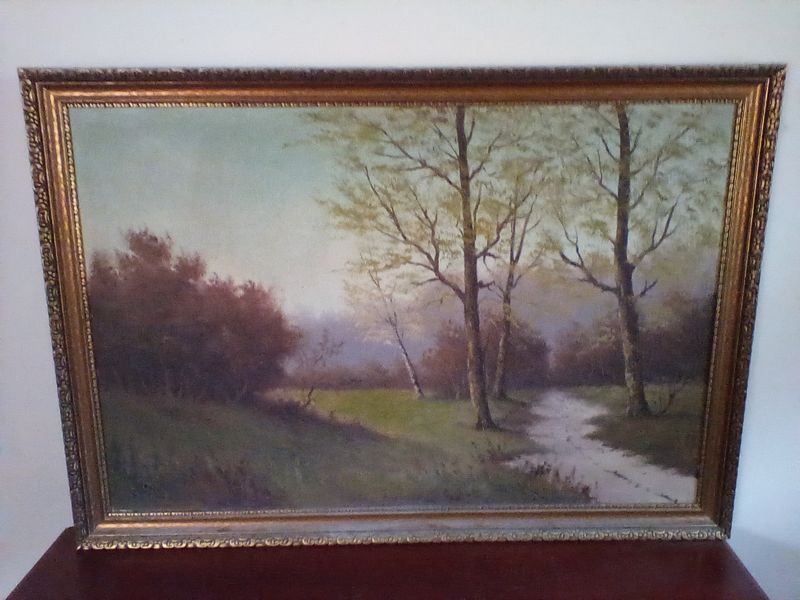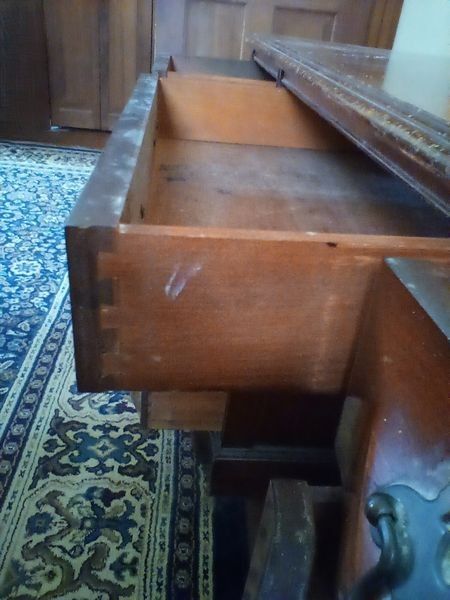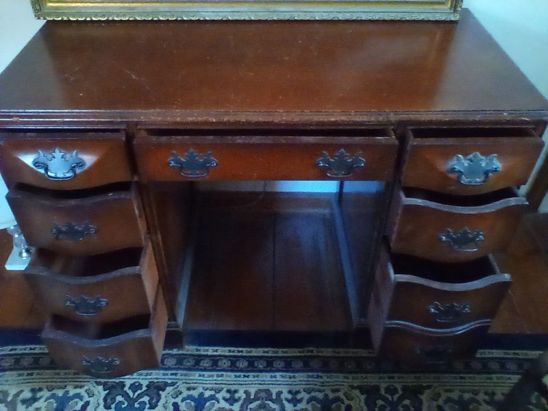 Antique Mahogany Desk, Chair, Art, Lamp. Eight dovetailed-drawer mag desk with bow front & original HW; highly-carved wood side chair; lg wall Vintage wall art; small table lamp. Rug seen in photo not incl. Located on the second floor.