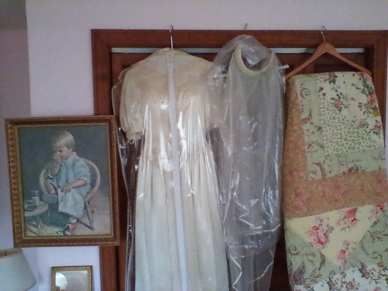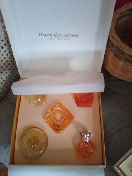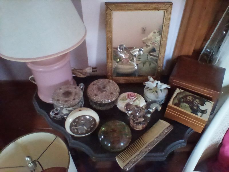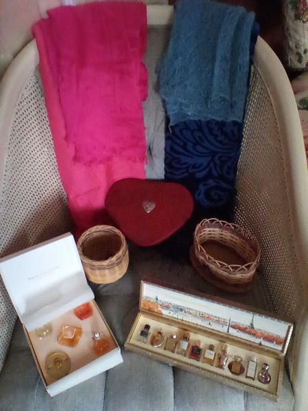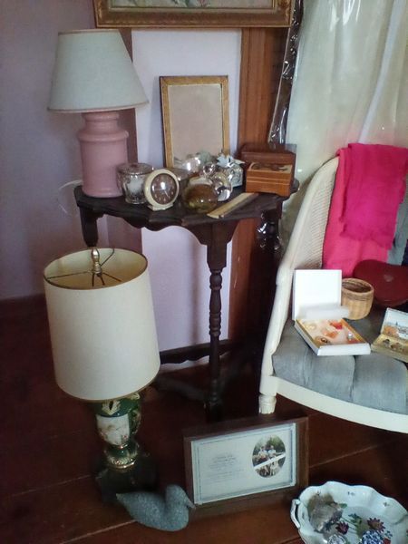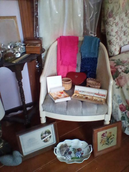 Boutique Items, featuring Wedding Dress and Veil. Furniture including boudoir chair; demilune table, 22"Wx31"H; two table lamps with shades; wall art; décor; mirror; covered dishes; perfumes (see photos); quilt; wedding dress (approx. size 10) with veil. Located on the second floor.