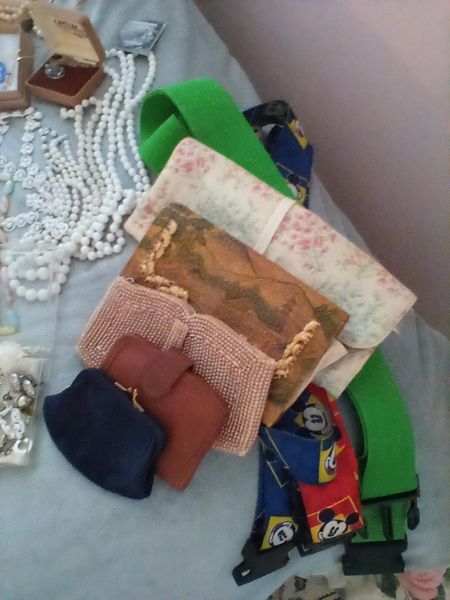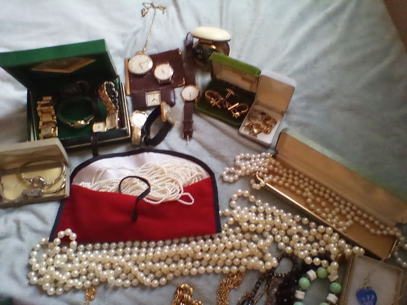 Jewelry, Watches, Purses. Vintage watches including pocket watch; wrist watches; watch in leather case (see photos); cuff links; tie pins; pearl necklaces; travel watch; more! See photos. Located on the second floor.