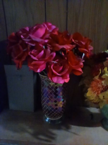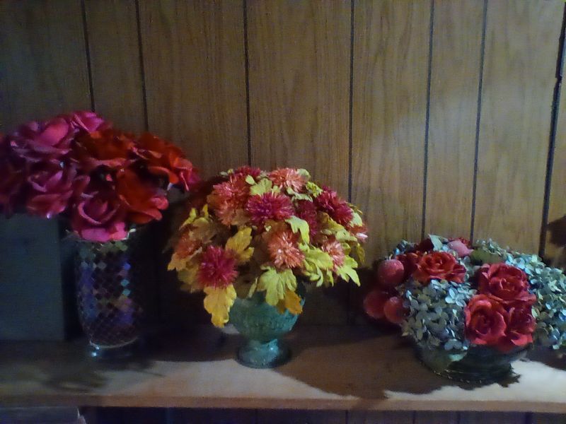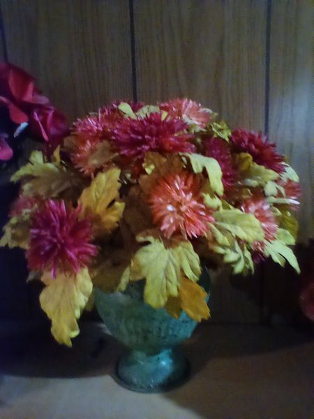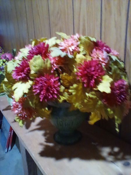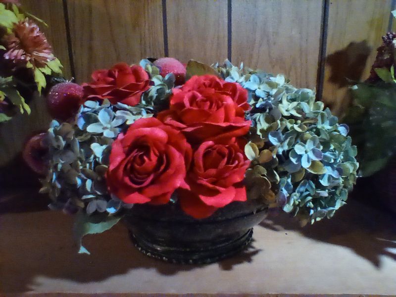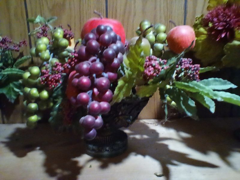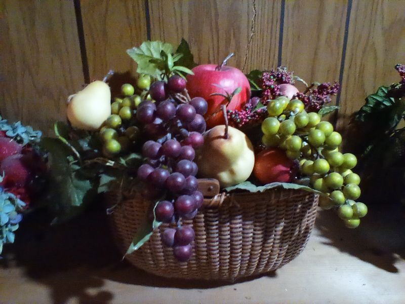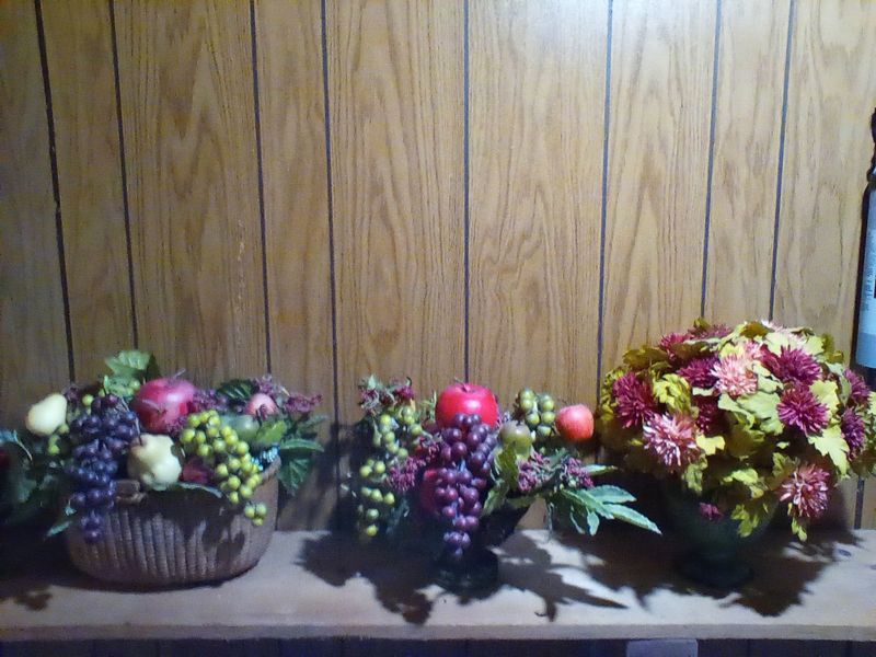 Quality Artificial Arrangements. Six artificial floral & fruit arrangements in a variety of containers (all one of a kind). Requires dusting, otherwise very good condition. Located in the basement.