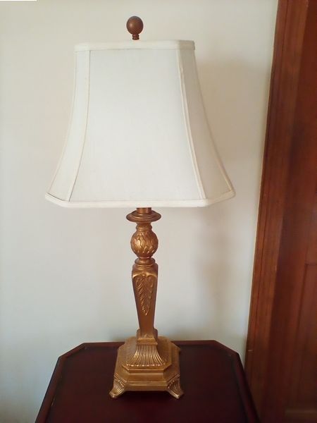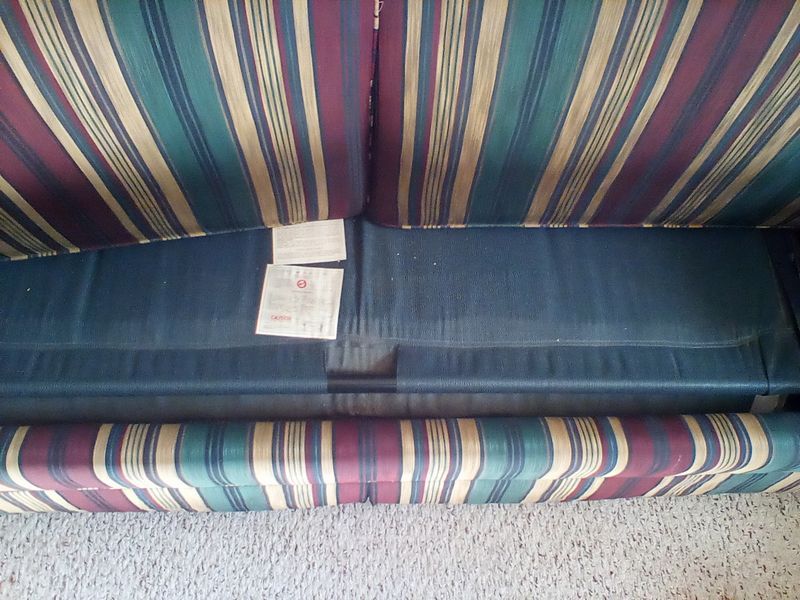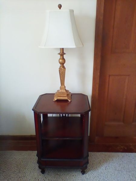 Sleeper Sofa, Table, Lamp. Striped camelback sleeper sofa, 85"Lx22"Dx31"H with two throw pillows; octagonal tiered side table, 19"Wx17"Dx26"H; metal table lamp with fabric shade.