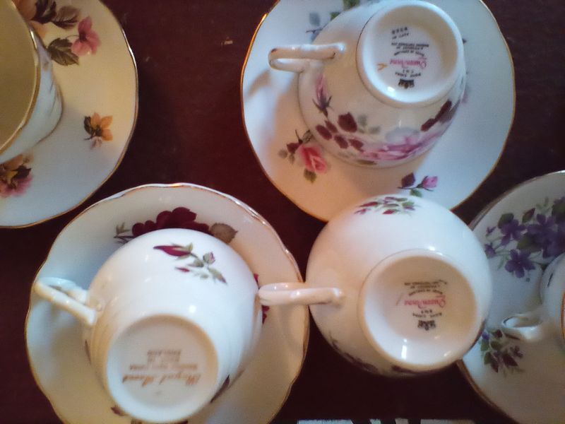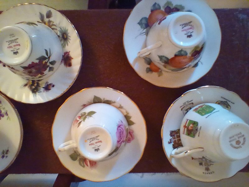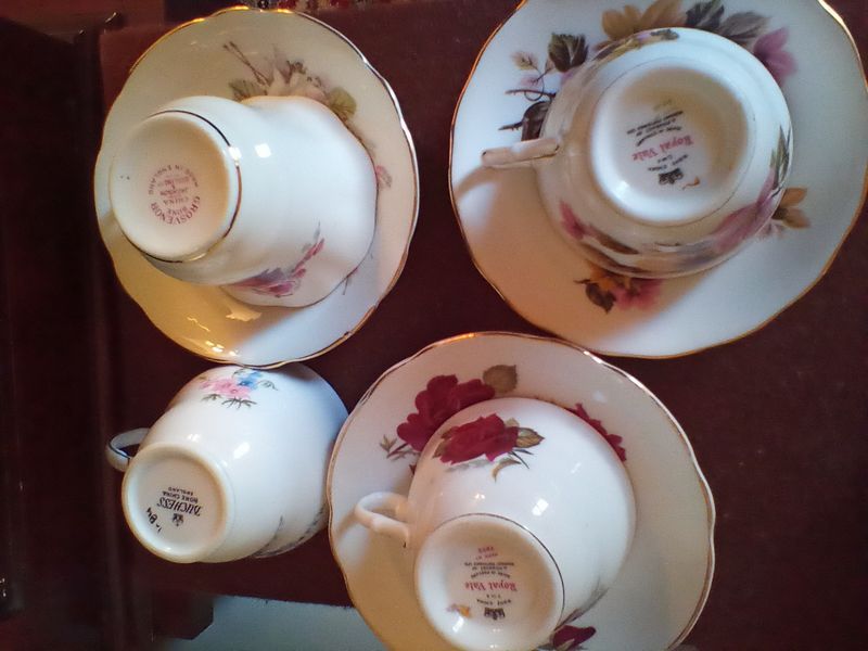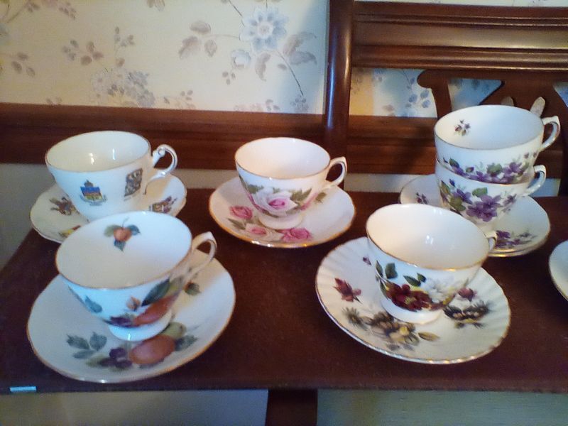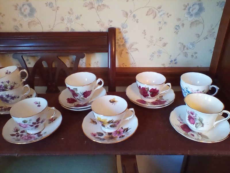 Porcelain Tea Cups and Saucers. Eleven complete sets, plus others. All marked by maker. See photos. Furniture not included.