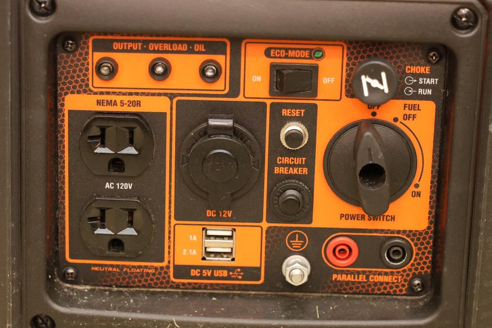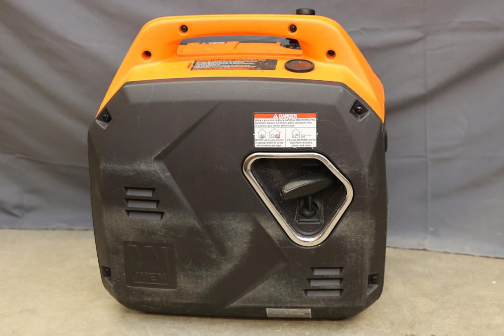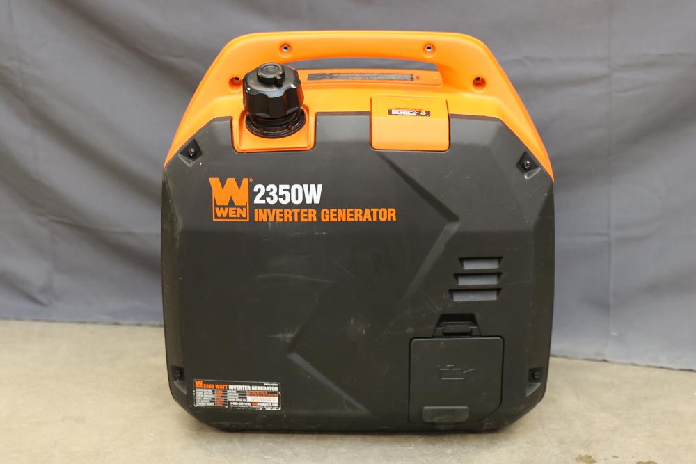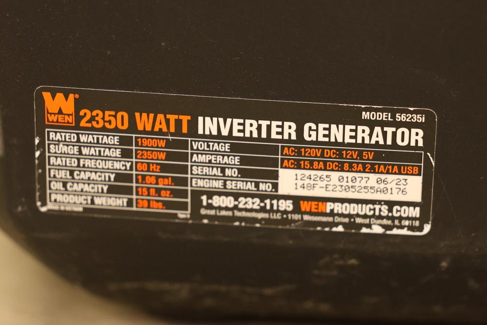 WEN 2350 Watt Inverter Generator Model 56235i with 1900W Rated Power. Features include a rated wattage of 1900W, surge wattage of 2350W, voltage output of AC 120V DC 12V 5V, and frequency of 60 Hz. Equipped with eco mode, parallel connection capability, and multiple outlet ports including NEMA 5-20R, USB, and DC power. Pickup only.
