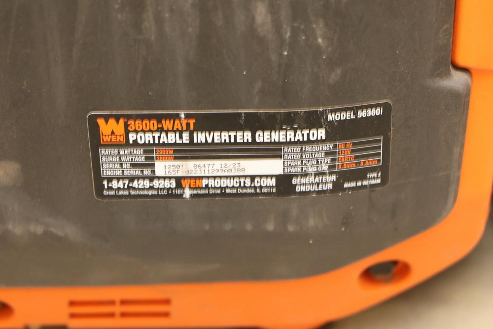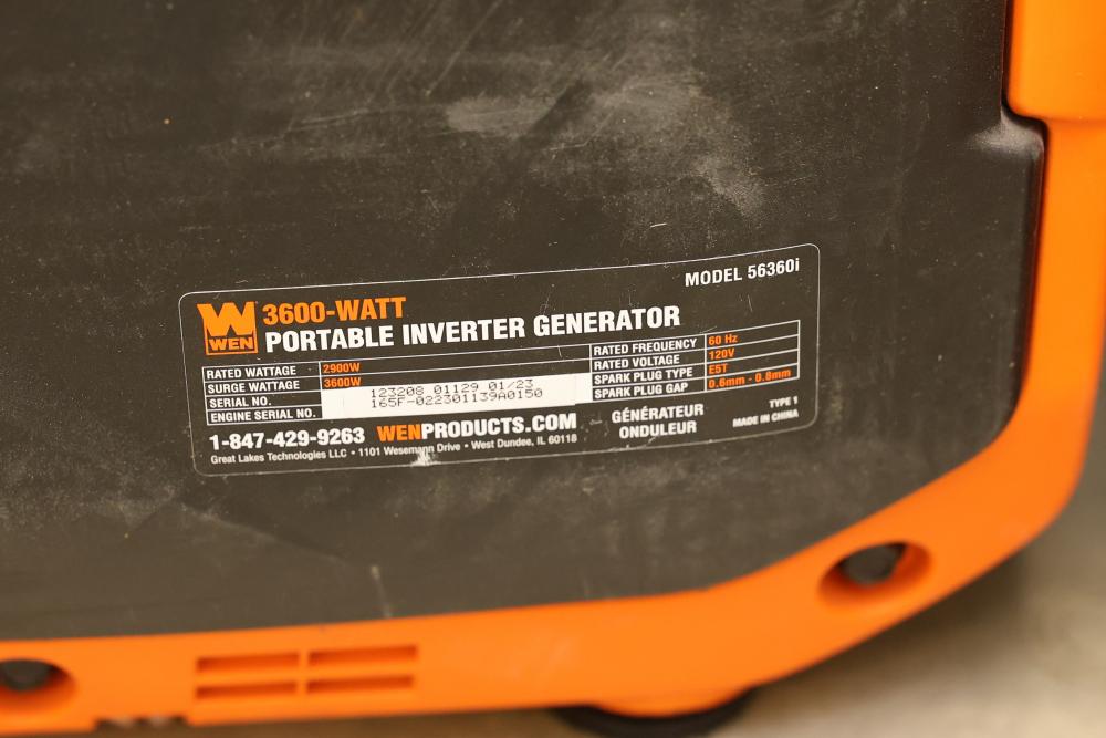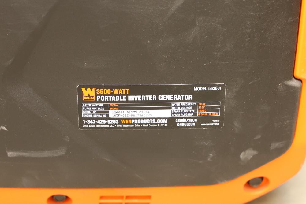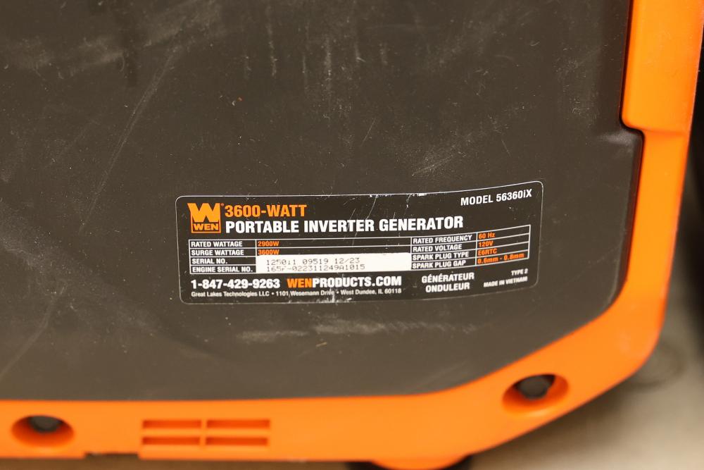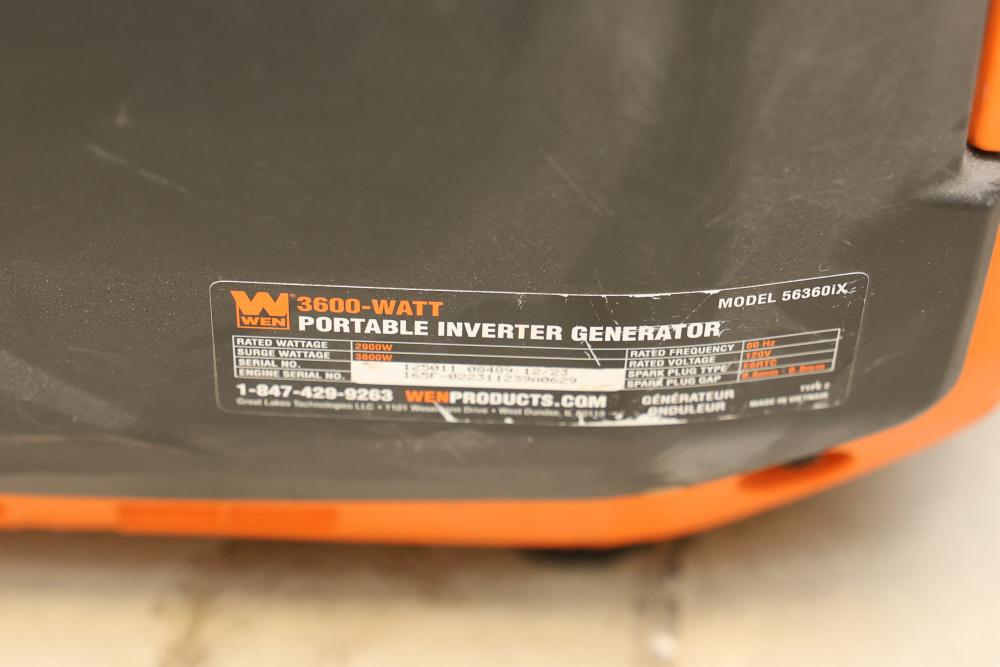 N/O Wen 56360ix And 56360i 3600W Portable Inverter Generators, Nonoperational. Includes 3 units of Wen 56360ix and 3 units of Wen 56360i models. Each unit is a 3600-watt portable inverter generator with rated wattage 3200W and surge wattage 3600W. These items are nonoperational. Pickup only.