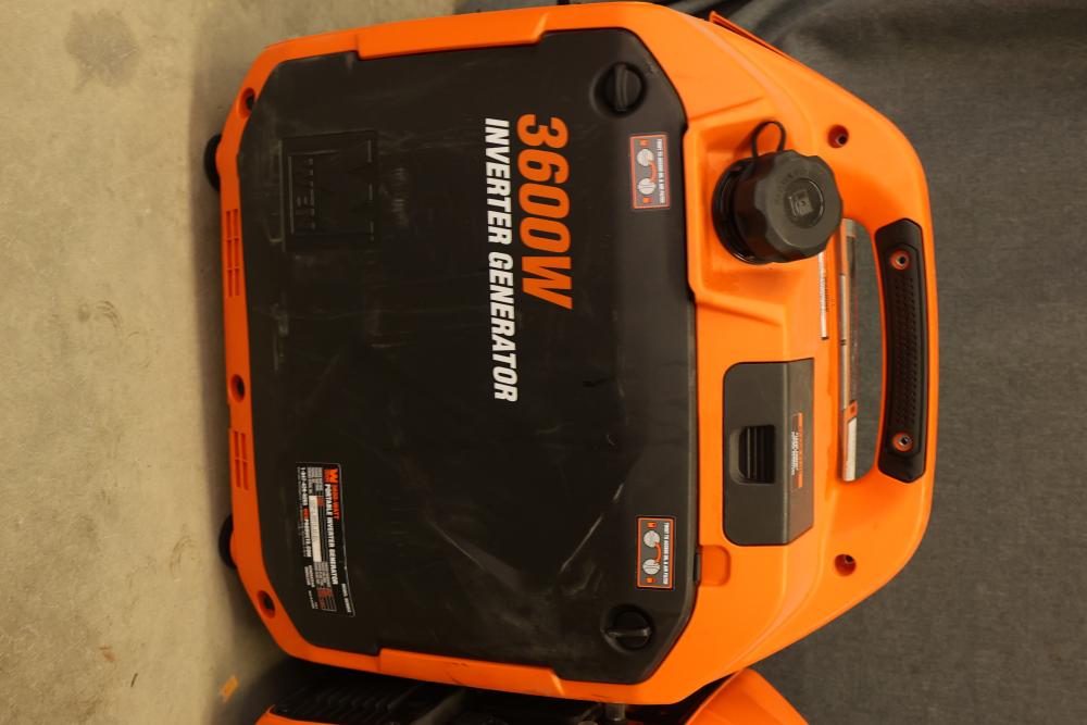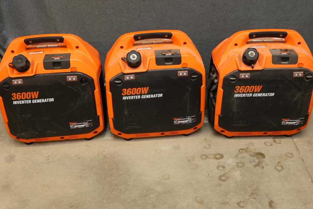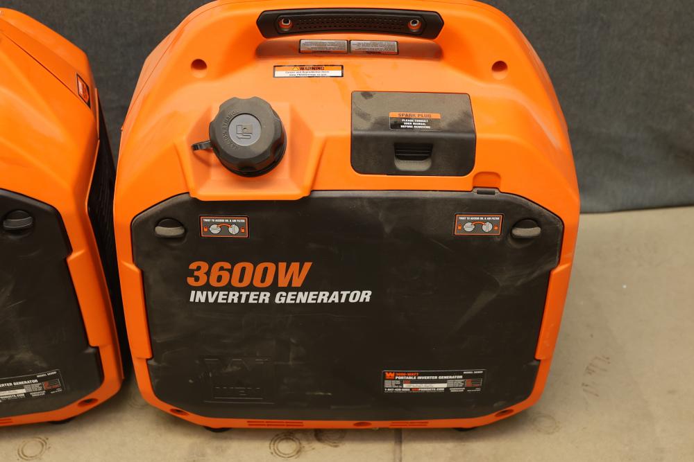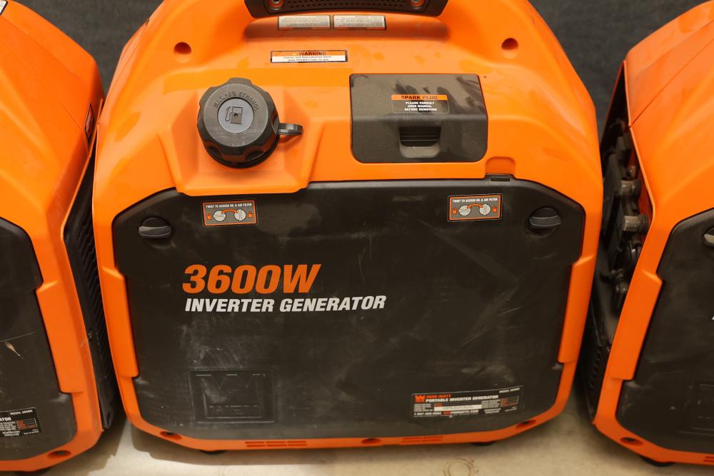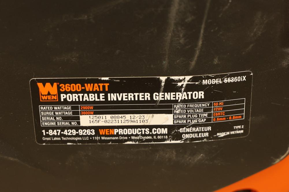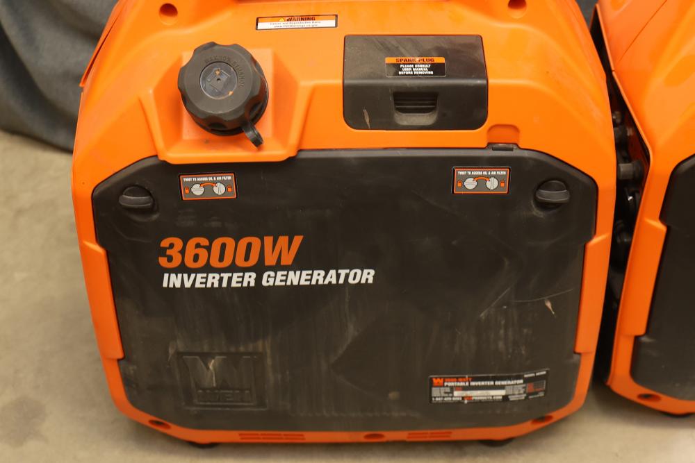 N/O Wen 56360ix And 56360i 3600W Portable Inverter Generators, Nonoperational. Includes 3 units of Wen 56360ix and 3 units of Wen 56360i models. Each unit is a 3600-watt portable inverter generator with rated wattage 3200W and surge wattage 3600W. These items are nonoperational. Pickup only.