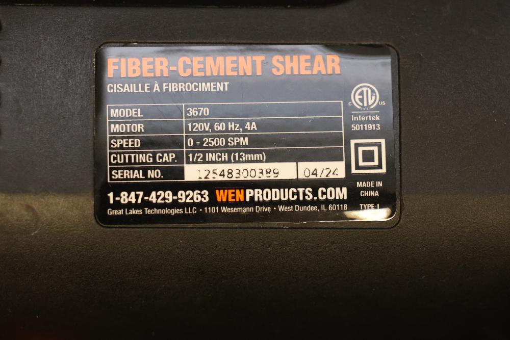WEN Variable Speed Fiber-Cement Shear, Model 3670. Motor: 120V, 60Hz, 4A. Speed: 0-2500 SPM. Cutting Capacity: 1/2 inch (13mm). For precise and efficient fiber cement cutting applications. Pickup only.