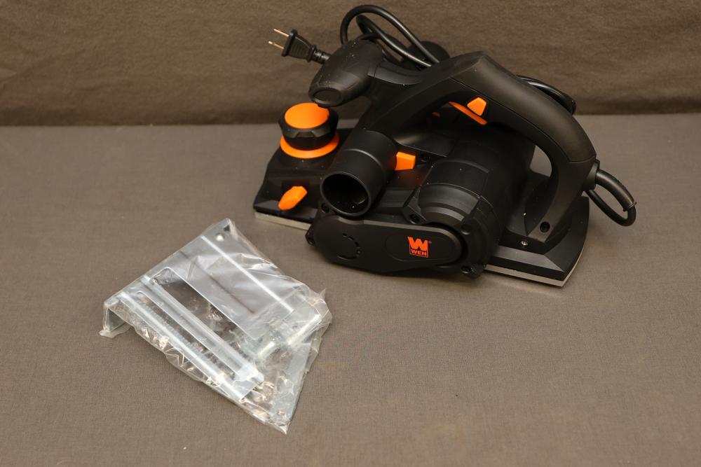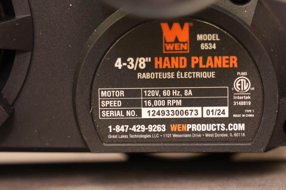 WEN 6534 4-3/8 Inch Electric Hand Planer. Features a motor rated at 120V, 60 Hz, 8A with a blade speed of 16,000 RPM. Includes accessories pictured. Pickup only.