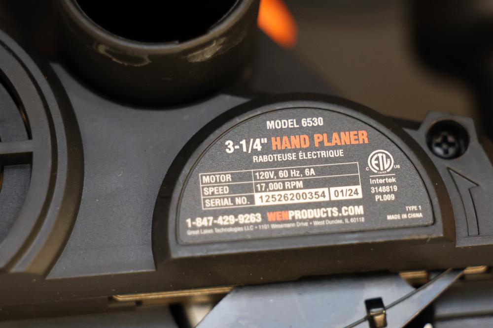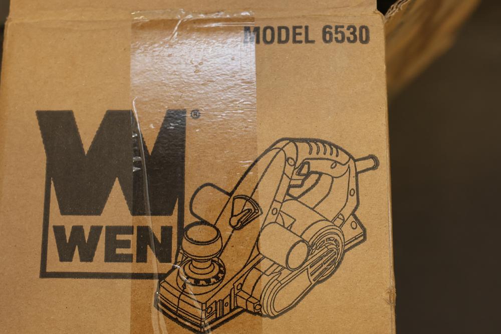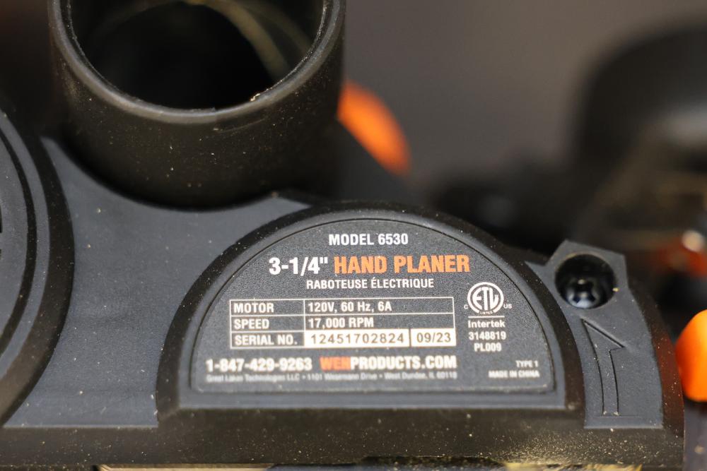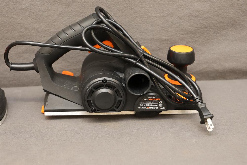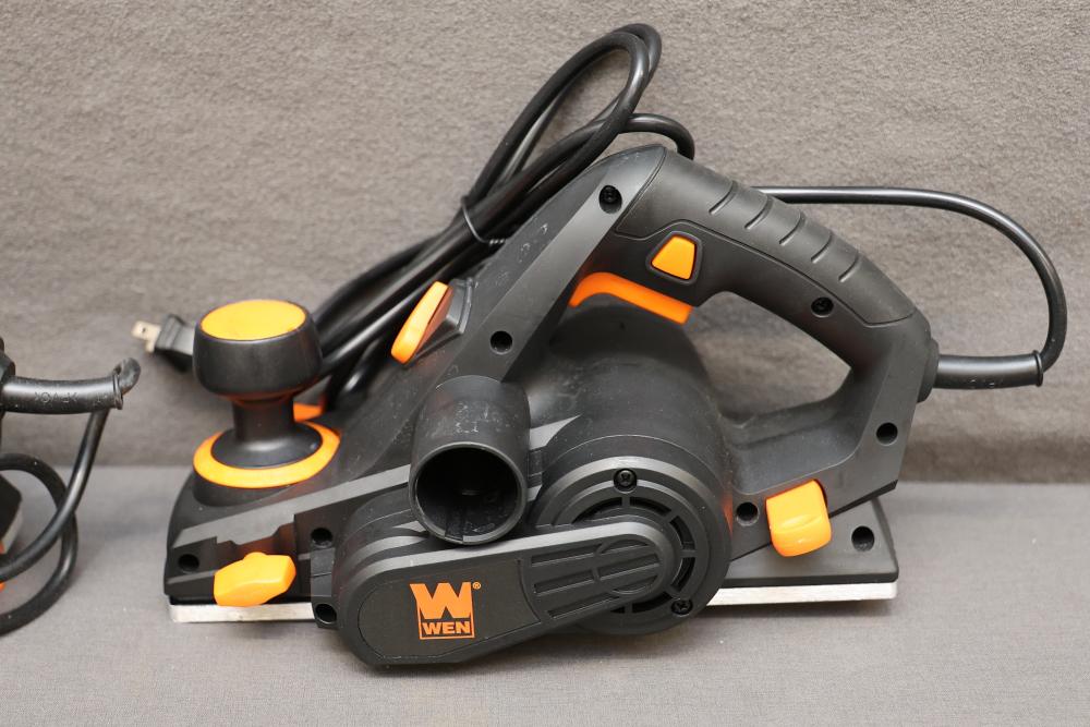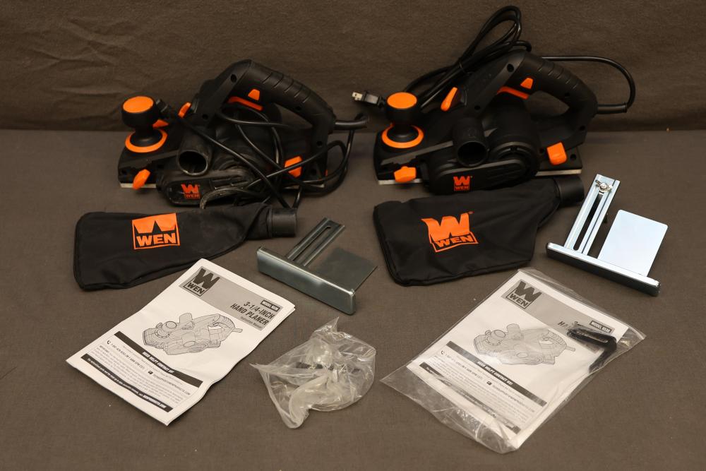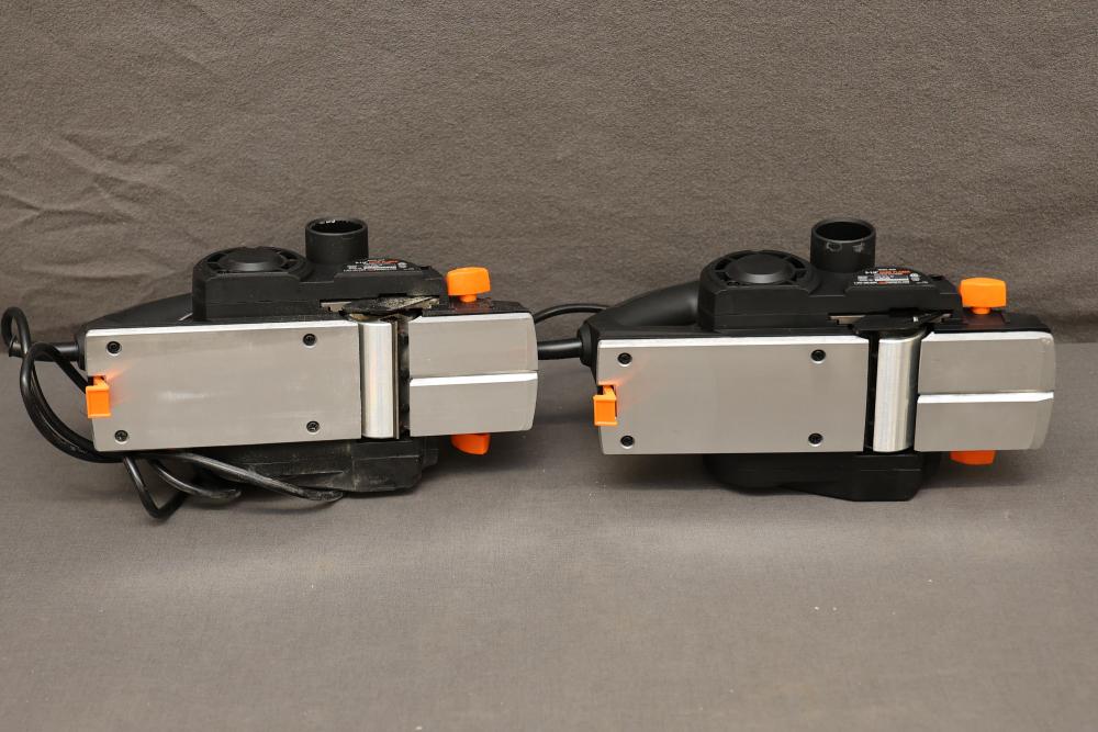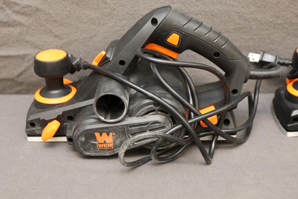 WEN Model 6530 3-1/4 Inch Electric Hand Planer Set of 2 Units. Includes two electric hand planers, guide fences, dust bags, and user manuals. Each unit operates at 120V, 60 Hz, with a 6A motor and a speed of 17,000 RPM. Pickup only.