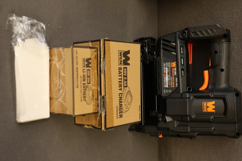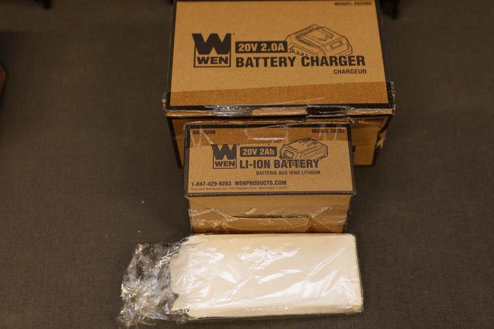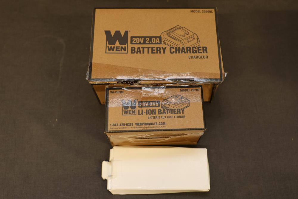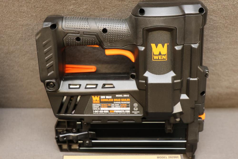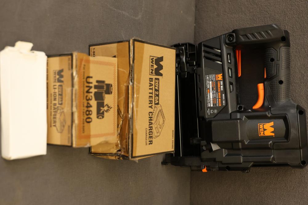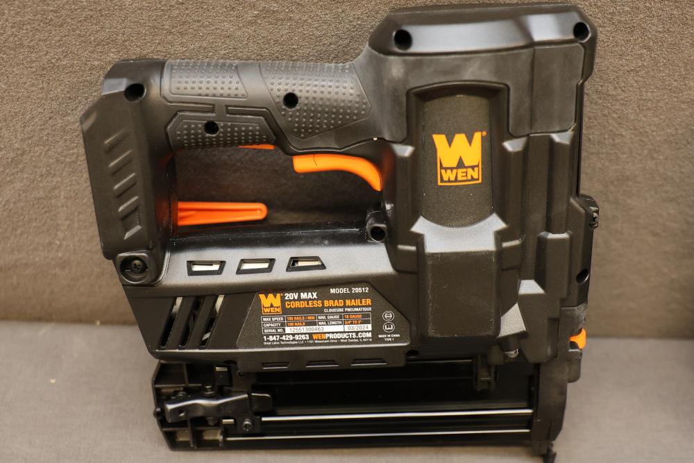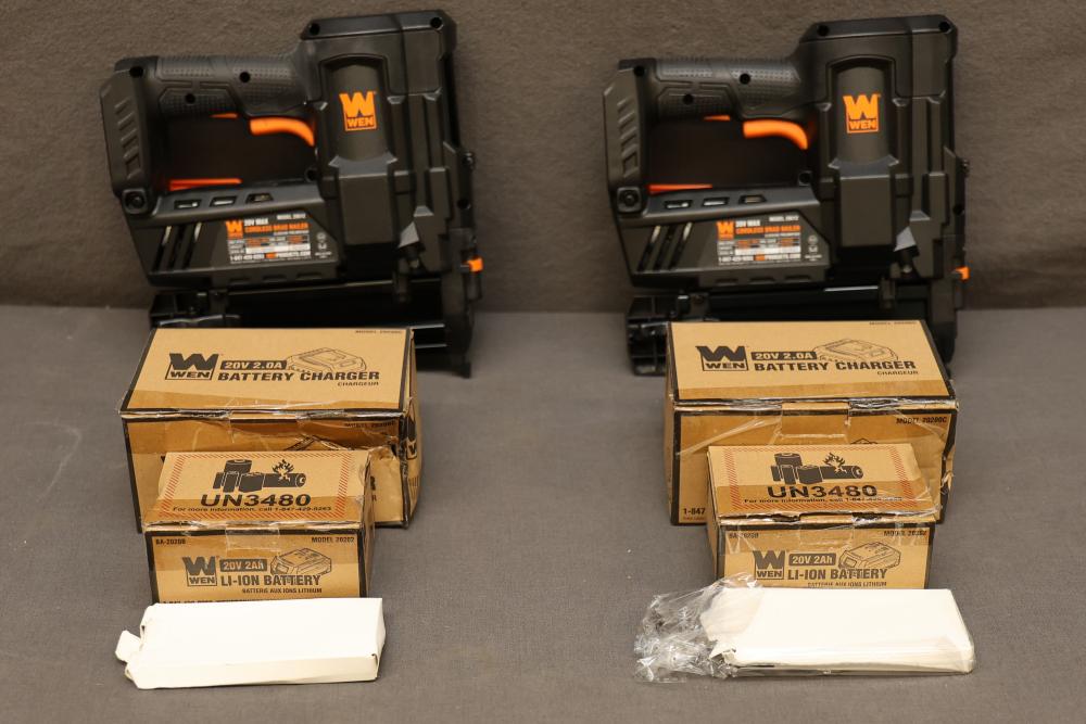 WEN 20V Max 18-Gauge Cordless Brad Nailer with Batteries and Chargers. Includes two cordless brad nailers, model 20512, each with a 20V Li-Ion battery, 20V 2.0A battery charger, and additional accessory pack. Pickup only.