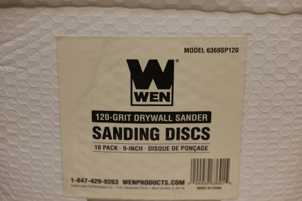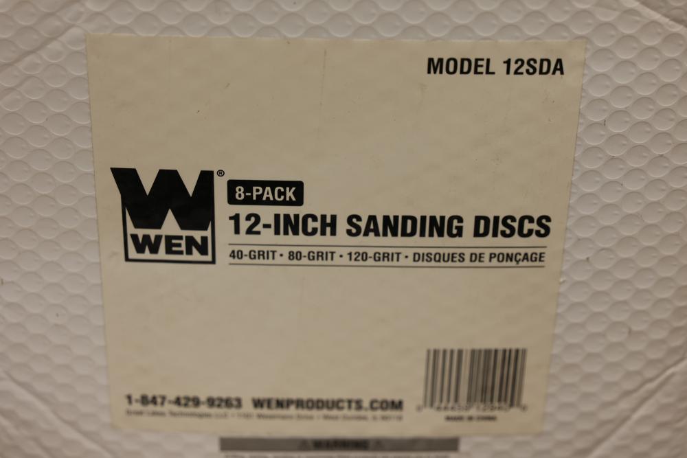 WEN 12-Inch Sanding Discs Model 12SDA and 9-Inch Sanding Discs Model 6369SP120. Includes 8-pack of 12-inch sanding discs in 40-grit, 80-grit, and 120-grit, and 10-pack of 9-inch sanding discs in 120-grit. Pickup only.