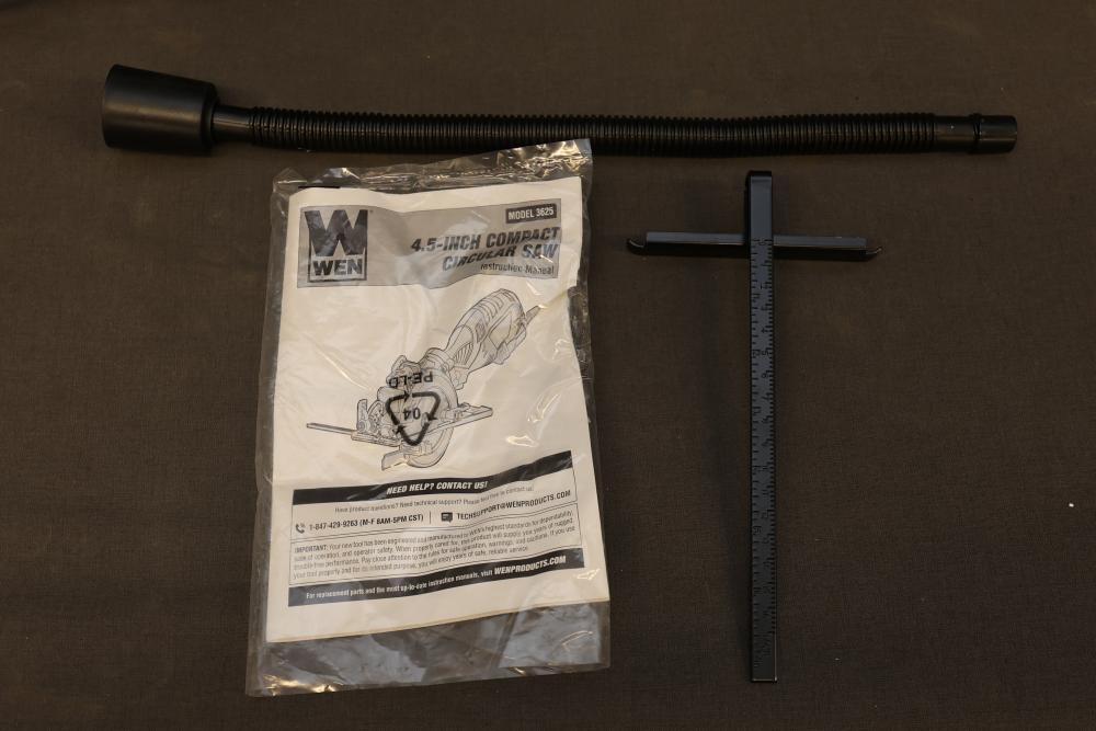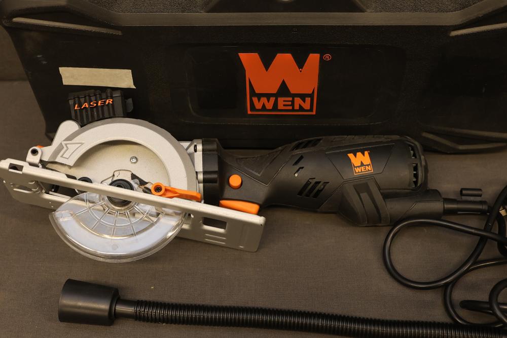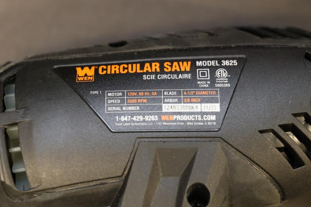 WEN Model 3625 4-Inch Circular Saw With Accessories. Includes a 4-inch circular saw, supporting tools, and carrying case. Features a motor with 120V, 60 Hz, and 3500 RPM speed, a 4.25-inch diameter blade, and an arbor size of 3/8 inches. Pickup only.