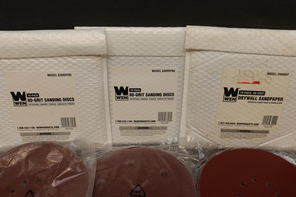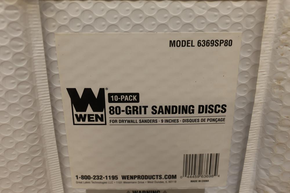 WEN 6369SP80 80-Grit Sanding Discs and Mixed Grit Options for Drywall Sanders. Includes multiple packs of sanding discs with various grit ratings, including P80, P100, P150, P180, and P240. Each sanding disc measures 9 inches in diameter and is designed for use with drywall sanders. Pickup only.