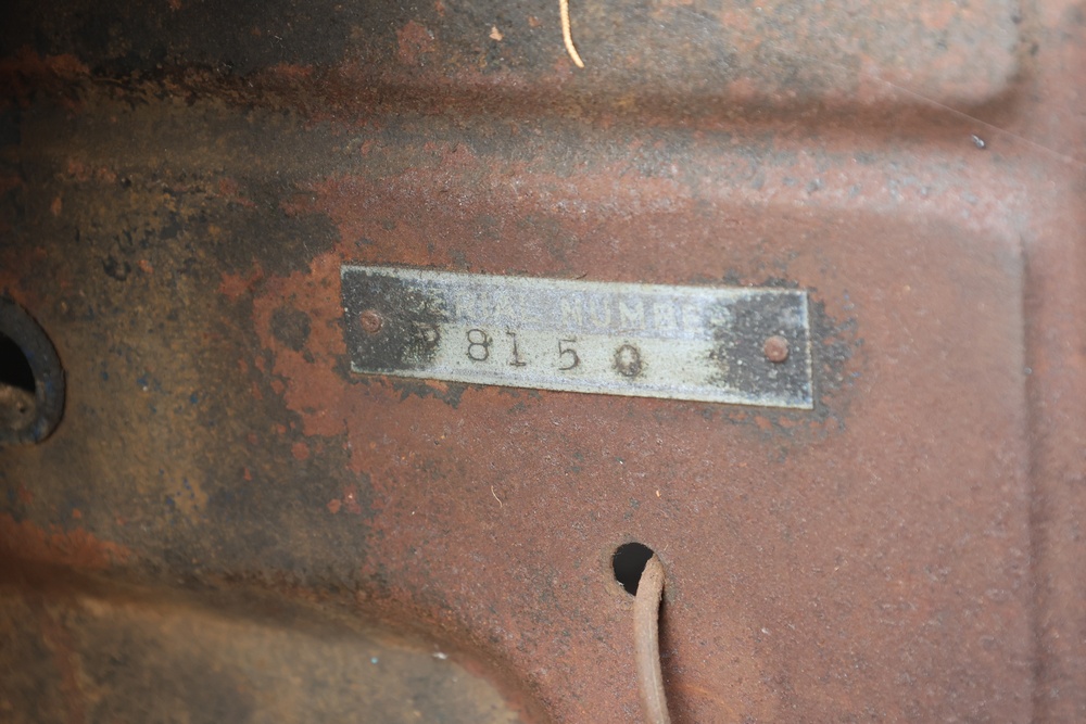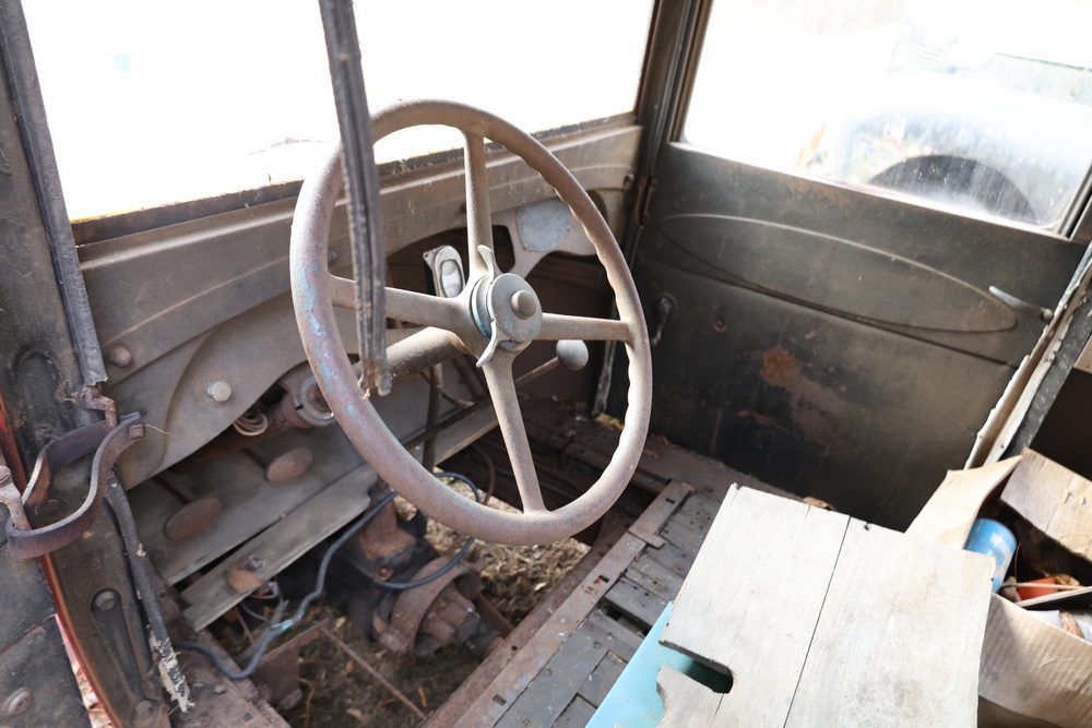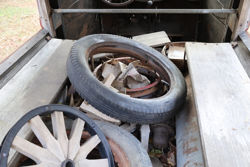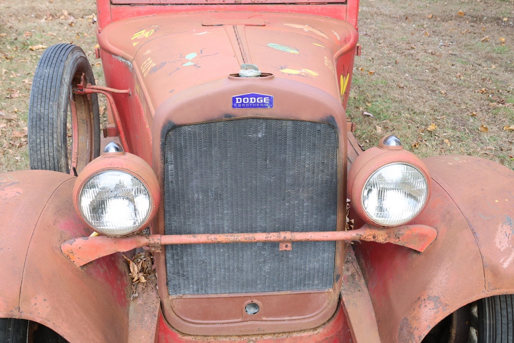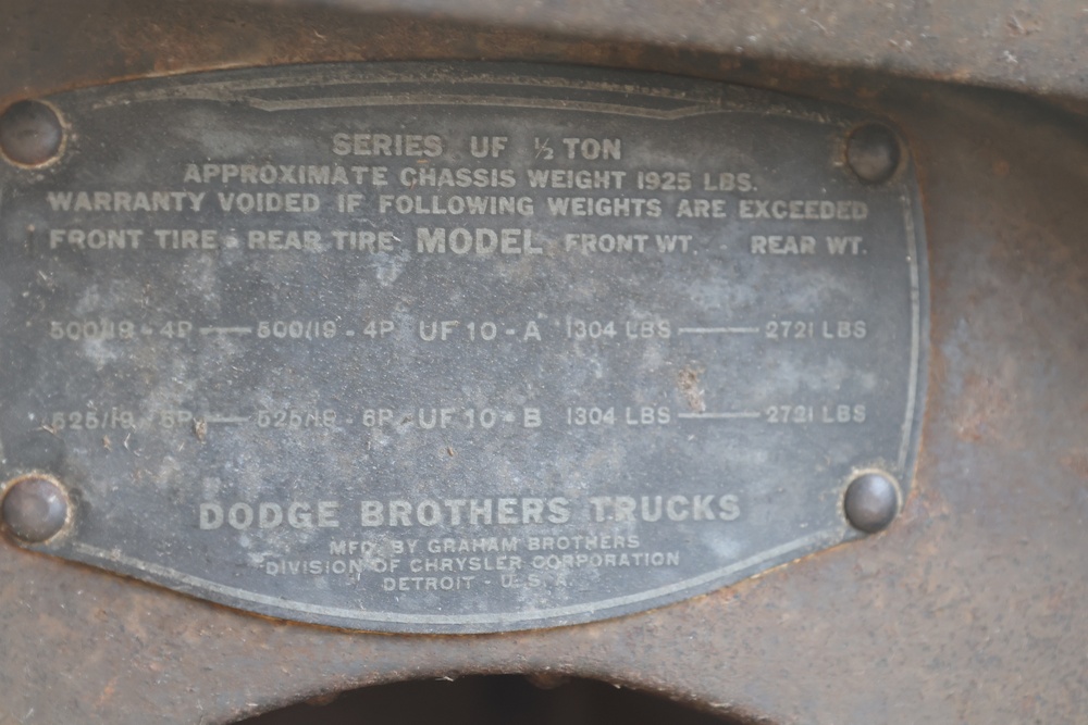 1925 Dodge Brothers truck, Series UF 1/2-ton. VIN: not present; serial plate shows number 8150. Odometer reading: not applicable. Equipped with an inline 4-cylinder gasoline engine and a manual transmission. Chassis plate indicates Series UF10-A/UF10-B with approximate chassis weight 1925 lbs. Body configured as an open-sided cab with wood plank flooring, steel fenders, and wooden-spoke wheels. Includes front-mounted headlamps, side-mounted spare wheel, and rear cargo platform. Seller reports the motor turned over when purchased last year. Bill of sale only.